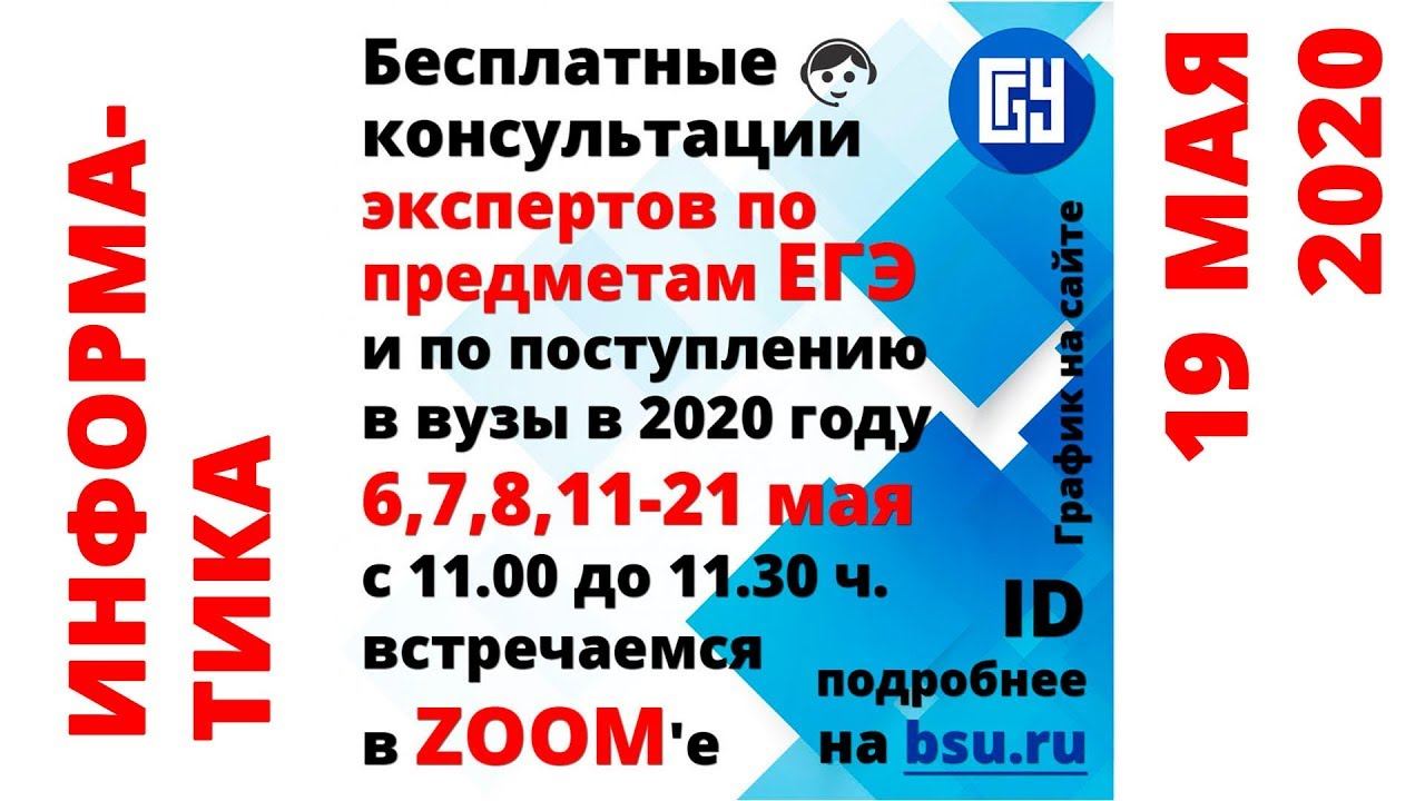 Уважаемые выпускники, их родители и классные руководители! С 6 по 21 мая пройдут бесплатные онлайн-консультации для учеников старших классов по всей России. 11 ведущих экспертов ЕГЭ проведут для вас консультации по всем общеобразовательным предметам, расскажут, как избежать ошибок и не потерять баллы. Ответственный секретарь Приемной комиссии БГУ даст подробную инструкцию, как будет проходить Приемная кампания-2020: что ждет абитуриентов, как в этом году подавать документы, какие существуют льготы, что такое конкурс, в какие даты будет проходить зачисление и многое другое. Консультации будут проходить на платформе ZOOM, присоединиться можно по ссылке https://us02web.zoom.us/j/9976663333 через ПК, планшет или телефон. Также будет вестись прямая трансляция с записью на канале "LifeBsu" в ютубе. Идентификатор конференции 997 666 3333 без пароля Начало консультаций в 11.00 согласно представленному графику. График онлайн-консультаций с экспертами по предметам ЕГЭ и по поступлению в вузы в 2020 году в новости по ссылке http://www.bsu.ru/news/22973/
