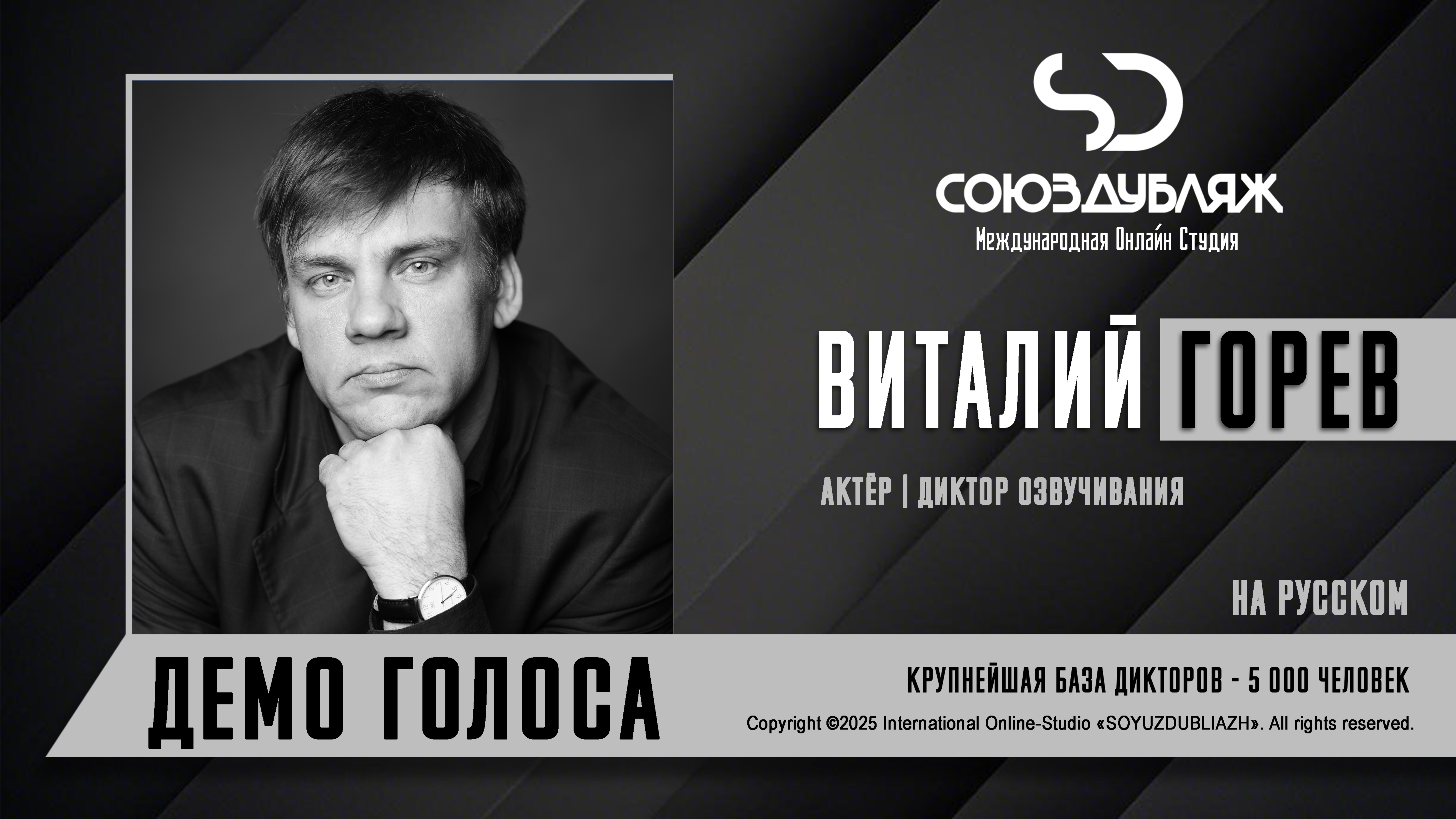 #СоюзДубляж #БазаДикторов #Озвучка ✔️Виталий Горев, актёр-диктор озвучивания. Международная Онлайн-Студия "СОЮЗДУБЛЯЖ" - профессиональная озвучка и дубляж. ▪️Рабочая группа в Телеграм: https://t.me/soyuzdubliazh ▪️Контакт для связи: https://t.me/SoyuzAdmin ▪️Подпишись:https://www.youtube.com/c/SOYUZDUBLIAZH ▪️Сайт: https://www.soyuzdubliazh.com/ Лучшие голоса для вашей аудиорекламы и видеороликов. База дикторов - 5 000 человек, профессионального уровня на ENG| FR| TR| RU| ISR| AZ| UA| KZ| UZ| языках. Мужские и Женские топовые голоса для озвучки любых проектов, таких как: Рекламы, Презентации, Фильмы, Сериалы, Игры, Мультфильмы, ТВ Шоу, Аудио-видео визитки. ✔️Сотрудничая с нами вы получаете свой проект под ключ, не выходя из дома или офиса. Наша слаженная команда из лучших дикторов, актёров озвучивания, режиссёров и звукорежиссёров в кратчайшие сроки озвучат или отдублируют ваш заказ на профессиональном уровне. Образцы работ нашего портфолио вы сможете посмотреть на канале СОЮЗДУБЛЯЖ. ВНИМАНИЕ: ✔️Мы приглашаем специалистов озвучки к сотрудничеству в нашей команде. Вы можете пройти по ссылке в наш телеграм канал и связаться с Админом для обсуждения. ✔️Всем заказчикам подобных медиа проектов по озвучки и дубляжу фильмов, сериалов, документалок обращаться непосредственно к Админу Телеграм группы СОЮЗДУБЛЯЖ, пройдя по ссылке: Проходи по ссылке: https://t.me/soyuzdubliazh International Online-Studio SOYUZDUDLIAZH presents a highly professional approach in voice-over and dubbing. ▪️Our working group https://t.me/soyuzdubliazh ▪️Chief manager https://t.me/SoyuzAdmin ▪️Follow https://www.youtube.com/c/SOYUZDUDLIAZH ▪️Web: https://www.soyuzdubliazh.com/ We offer You the best Voices for your Audio commercials and Video`s. Our Database contains over 5 000 voices of native speakers and high-class foreign language specialists in ENG| FR| TR| RU| ISR| AZ| UA| KZ| UZ|. Male & Female top level voices for all the variety of dubbing projects such as commercials, presentations, movies, TV-series, video and computer games, cartoons, TV-shows, audio & video portfolio’s – all in one place. As your business partner we guarantee a turn-key project without you leaving your house or office. Our target is to make sure that the dubbing of your project is made as quick as possible by a well-coordinated and professional team of the best speakers, film and sound directors. To whom it may concern! We invite dubbing specialists to join our team. Please contact our manager on Telegram https://t.me/soyuzdubliazh