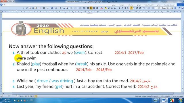 شرح مفصل للماضي البسيط والماضي المستمر امثلة توضيحية حلول للاسئلة الوزارية من عام 2014 - 2019 ولجميع الادوار