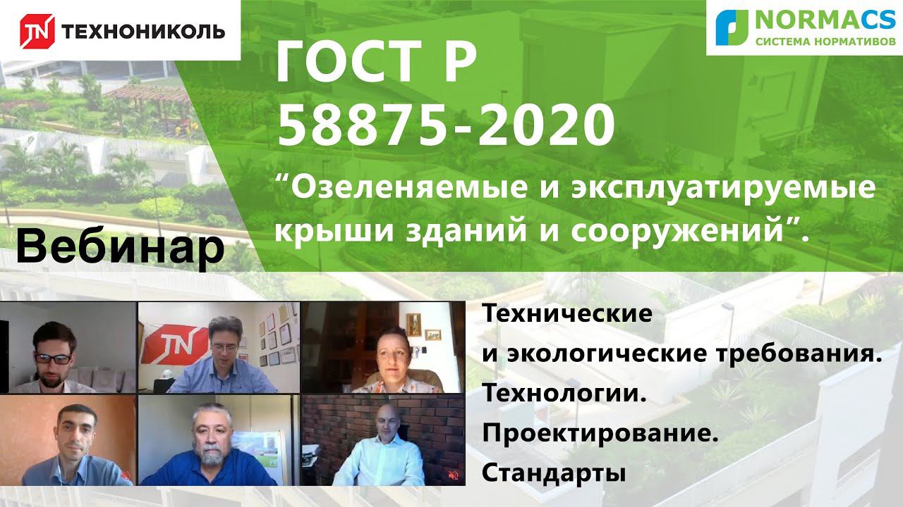 Вебинар посвящен “ГОСТ Р 58875-2020 Озеленяемые и эксплуатируемые крыши зданий и сооружений. Технические и экологические требования”. Этот национальный стандарт вступил в силу 1 июня. Что изменится с его введением и какие требования предъявляются к материалам для озеленения крыш зданий и сооружений по всей России. Рассказывают исполнительный директор Национального кровельного Союза Елена Пахутко, руководитель руководитель НОЦ «Зеленые стандарты» НИУ МГСУ Андрей Бенуж, ландшафтный архитектор Илья Мочалов, руководитель инженерно-технического центра корпорации Технониколь Алексей Арабов, главный специалист компании «ЦинКо РУС» Алексей Веинский. www.normacs.info