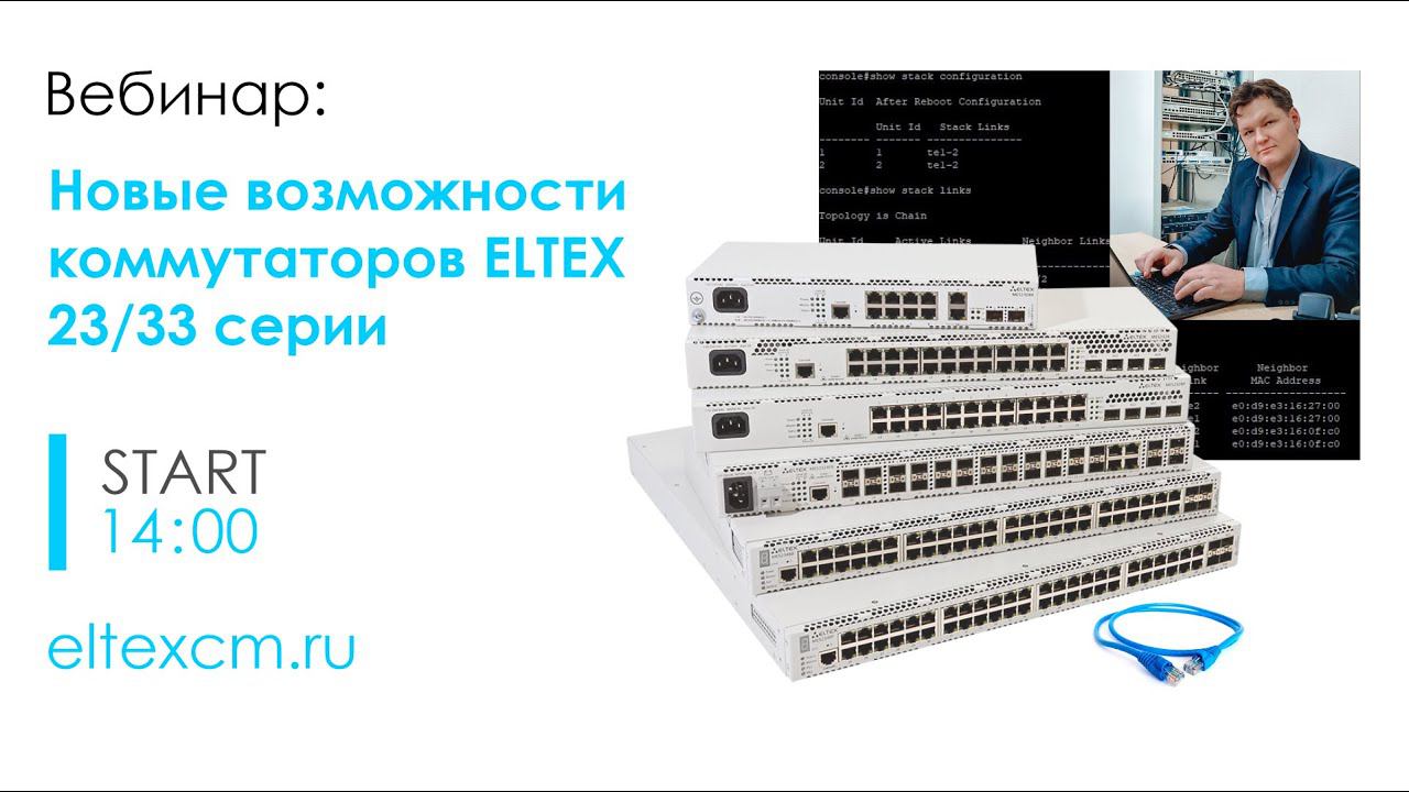 Приглашаем вас посетить вебинар по коммутаторам ELTEX "Новые возможности коммутаторов 23/33 серии" В программе вебинара: • Изменения в работе стека • Расширение функционала маршрутизации • Поддержка VRF Начало: 16.09 в 14:00 по МСК Ведущий вебинара: Алексей Листаров - наш инженер с многолетним опытом работы в крупном операторе связи. 01:02 Вступление 05:07 Изменение в работе стека 35:49 Поддержка VRF в коммутаторах 23 и 33 серии 53:55 Новые возможности поддержки OSPF 1:08:27 Ответы на вопросы https://eltexcm.ru/