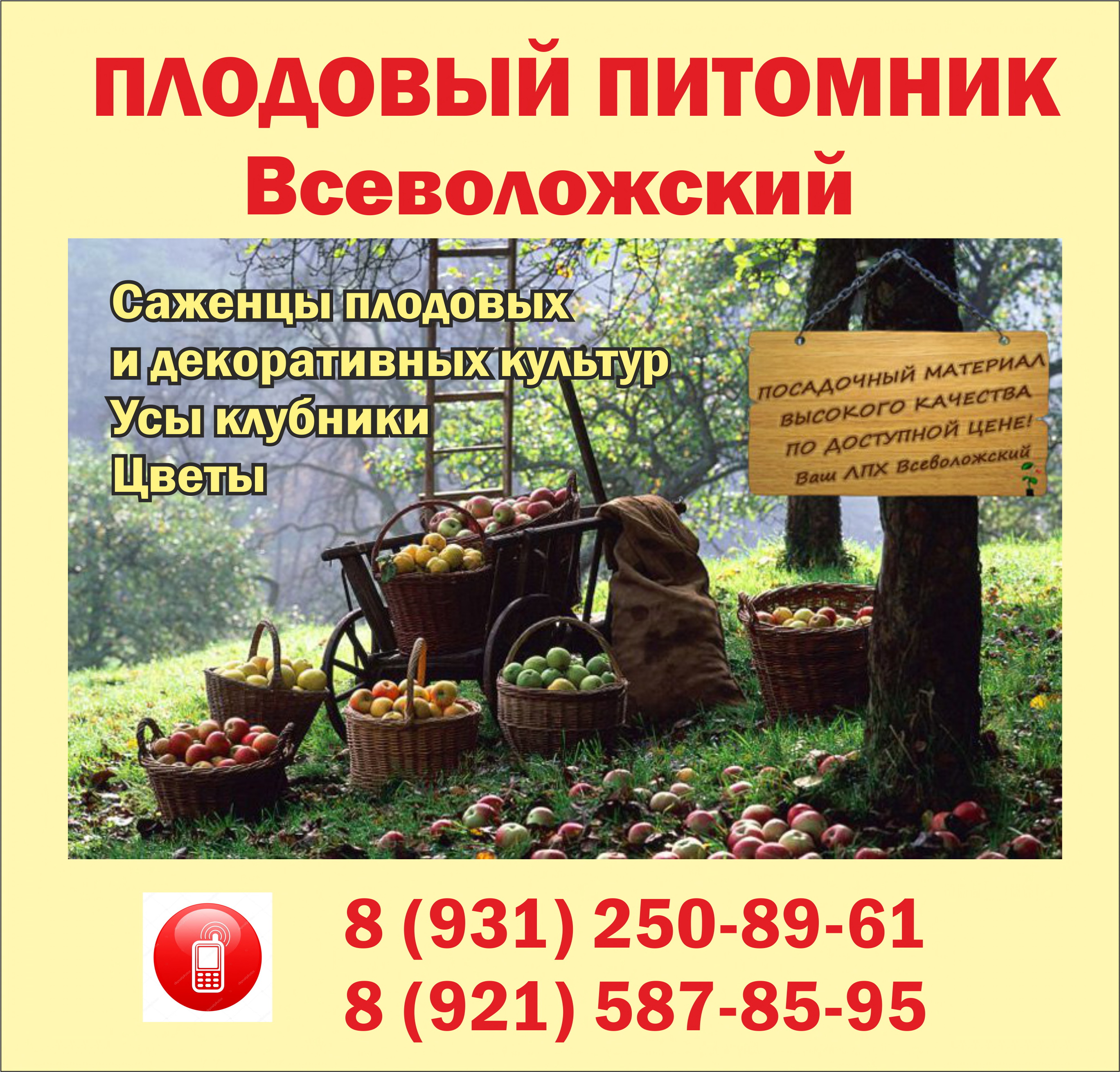 Личное подсобное хозяйство — плодопитомник "Всеволожский" Более 20 лет мы выращиваем и предлагаем на продажу: - саженцы плодово-ягодных деревьев и кустов - усы клубники - виноград плодовый - декоративные растения - хвойные растения - розы, пионы, многолетние цветы Посадочный материал районирован, привои сертифицированы, прививки выполняются опытными специалистами. Работа по профилактике болезней и насекомых-вредителей ведется в соответствии с требованиями. Материал здоровый и хорошего качества. Растения предлагаем в контейнерах различной емкости, посадка в которых производится до заморозков. Ленинградская область, Всеволожский р-н, Колтушское сельское поселение, СНТ "Вирки-2", дорога АРО-Вирки (ул. Кленовая), д. 55 Тел.: 8 (931) 250-89-61 Тел.: 8 (921) 587-85-95 Сайт: всевплод.рф ВКонтакте: vk.com/vsevplod Email: vsevplod@yandex.ru