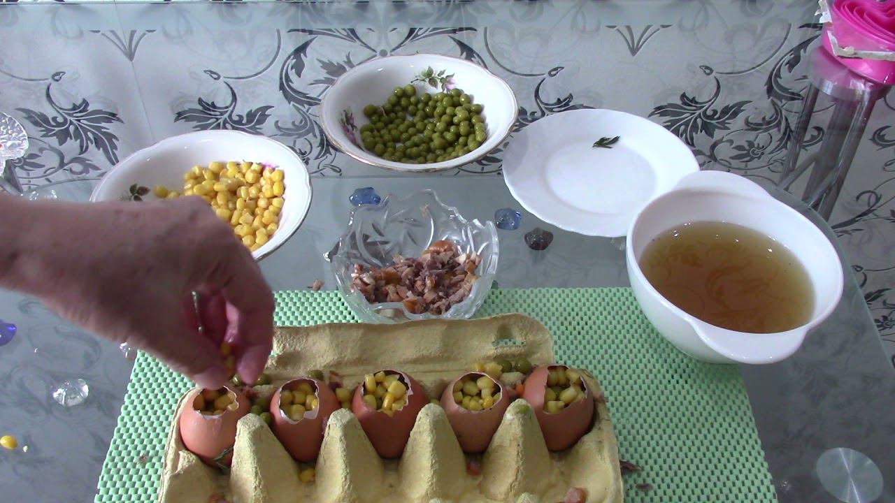 Рецепт пирожного https://youtu.be/d3JEcpq_qEo Рецепт заливного: Скорлупа яиц - 5 штук Мясо(колбаса) - 100 грамм Болгарский перец 1/2 штуки Зеленый горошек - 70 грамм Кукуруза - 70 грамм Зелень - укроп, петрушка Желатин - 10 грамм Бульон говяжий - 100 мл. Соль по вкусу На 5 часов в холодильник