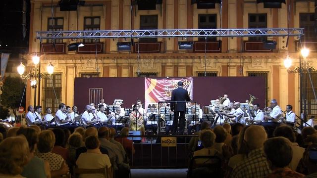 Concierto Extraordinario Víspera de la Virgen de los Reyes. Lola Vega y la Banda Sinfónica Municipal de Sevilla bajo la dirección de Francisco Javier Gutiérrez Juan interpretan El Amor Brujo de Manuel de Falla en la Plaza Virgen de los Reyes. 14 de agosto 2015.
