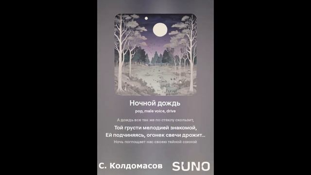 Драйвовый поп! Текст - С. Колдомасов Аудио и визуал - Suno AI Стихи: Сергей Колдомасов - "Ночь Дождь Ты и я" (2023/11/13) (на сайте стихи.ру). Никакой вульгарщины или пропаганды, все совпадения чисто совпадения!
