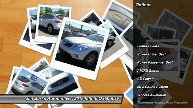 2015 Infiniti QX50 http://www.jimburke.com For more information on this vehicle and our full inventory, call us at 888-253-6692 Jim Burke Automotive 1301 5th Avenue North Birmingham AL 35203 *Priced Below Market! This QX50 will sell fast!* *Carfax One Owner - Carfax Guarantee* *Leather Seats* *Auto Climate Control* *Satellite Radio* *Jim Burke Pre-Owned Super Center prides itself on value pricing its vehicles and exceeding all customer expectations! The next step? Give us a call to confirm availability and schedule a hassle free test drive! We are located at: 1400 5th Avenue North, Birmingham, AL 35203.* Jim Burke! Where THE SALE NEVER ENDS! BACK by popular demand, FREE Oil Changes & Wiper Blades for LIFE! ALL Customers, parts and labor included!