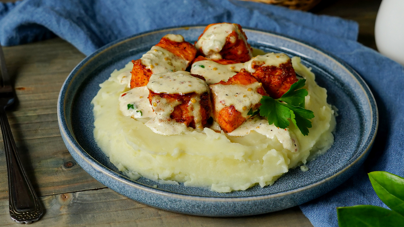 Ингредиенты: лосось - 700-800 гр растительное масло - 2 ст.л соль - 1/2 ч.л приправа для рыбы - 1ч.л копченая паприка - 1 ч.л сливочное масло - 50 гр чеснок - 2 зубчика сливки 33% - 200 мл лимонный сок - 1 ст.л прованские травы - 1 ч.л зерна горчицы - 1 ч.л петрушка 1. Рыбу нарежьте крупными кубиками 2. Добавьте растительное масло, соль, приправу для рыбы и копченую паприку. Перемешайте и оставьте мариноваться на 20 минут 3. Сливочное масло растопите на горячей сковороде 4. Добавьте чеснок и обжаривайте его 1 минуту 5. Влейте сливки и лимонный сок. Перемешайте 6. Добавьте прованские травы, соль, зерна горчицы, доведите до кипения и готовьте еще 1-2 минуты 7. Добавьте петрушку и тщательно перемешайте. Соус готов 8. Обжарьте рыбу в течение 10-12 минут Подавайте рыбу с картофельным пюре, сверху полейте соусом Приятного аппетита!