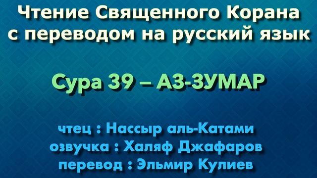 Кира'ат/Чтение с озвучкой Корана Чтец: Насир аль-Катами Озвучка: Халяф Джафаров Перевод: Эльмир Кулиев Источник YouTube канал: " Священный Коран "
