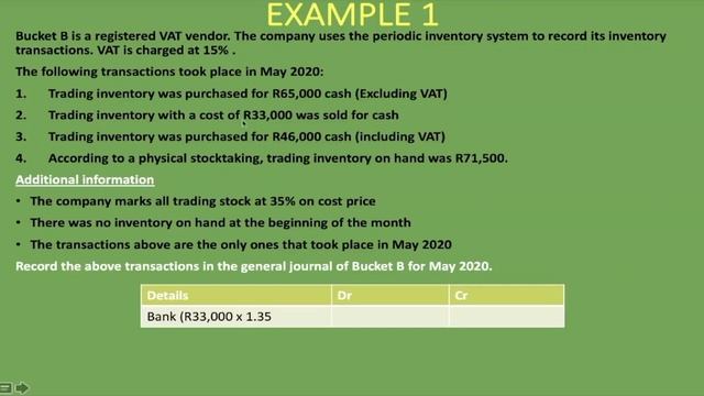 In this accounting lesson, we explain and go through examples of inventory and Value Added Tax (VAT) where we do the journal entries under the periodic inventory system. We go through transactions where we bought inventory using cash, where we sold inventory and recording inventory after physical stocktaking. In our journal entry, we account for inventory, bank, sales, cost of sales, Value Added Tax (VAT) using the periodic inventory system. Timestamps Inventory with VAT journal entries using the periodic inventory system: 00:00 VAT (Value added tax) definition / meaning: 00:42 Input VAT definition explained: 01:15 Output VAT definition explained: 01:49 Inventory with VAT journal entry examples: 02:50 Inventory purchase with VAT journal entry using the periodic inventory system: 04:36 Inventory sold with VAT journal entry using the periodic inventory system: 07:43 Closing inventory using Periodic inventory system journal entry: 14:28 Debits & Credits in Accounting | Journal Entries Examples | Accounting Basics: https://youtu.be/DjONzUPnhkM Simple Formula for Calculating Percentages | Want over Have Formula: https://youtu.be/K80KmHZmKIA Inventory Explained: https://youtu.be/1gsOlay8Dpw Inventory with VAT | Journal Entries | Perpetual Inventory System: https://youtu.be/XtUyAVCjCMM Inventory Journal Entries | Perpetual Inventory System | Explained with Examples: https://youtu.be/l_Nxoqsyf-Q Periodic Inventory System Explained with Journal Entry Example: https://youtu.be/-JMKSaQiaiU Sales On Credit - Perpetual Inventory System Journal Entry: https://youtu.be/krhLje8L4IA FIFO (First-In-First-Out) Method - PERPETUAL Example: https://youtu.be/5xtL-95lLdI First In First Out (FIFO) | PERIODIC Example: https://youtu.be/NNCMoiGkv6A Weighted Average Inventory Costing | PERPETUAL Example: https://youtu.be/GW3rsCCAUkw LIFO Method Accounting - Perpetual: https://youtu.be/WlGdJvPx6jQ Check out other straight-forward examples on our channel. We also offer one-on-one tutorials at reasonable rates. Connect with us: Email: info@counttuts.com Our Website: https://Counttuts.com Our Facebook Page: https://www.facebook.com/Counttuts Support our Efforts: https://www.patreon.com/Counttuts