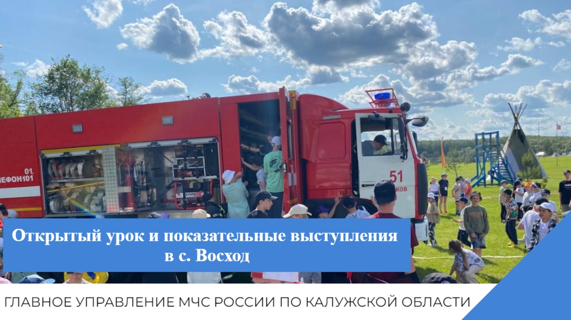 ?Огнеборцы пожарно-спасательной части 51 и инспектора отдела надзорной деятельности по Жуковскому району провели открытый урок и показательные выступления в селе Восход на базе отдыха «Пайн Ривер» для детей первой смены от 7 до 15 лет. ?Начальник МОНД и ПР Жуковского и Тарусского района Александр Ларионов, дознаватель Валерия Руденко, инспектор Анастасия Сичевая рассказали детям, как вести себя во время пожара, показали, как пользоваться огнетушителями. ?Начальник караула ПСЧ-51 Евгений Рагулин, пожарный Михаил Тиханов и водитель Александр Пономарев рассказали детям о работе огнеборцев, о пожарной охране, про пожарные машины, о работе и жизни пожарных, а также напомнили правила пожарной безопасности. ? Спасатели разъяснили ребятам последствия нарушения требований пожарной безопасности, напомнили о недопустимости игр с огнем, показали оборудование которое используют пожарные при тушение пожаров и при проведение аварийно-спасательных работ. ?В конце мероприятия спасатели организовали показательные выступления. Огнеборцы на своем примере показали ребятам, как правильно и быстро надевать боевку, показали работу с пожарным вооружением. Дети с удовольствием примеряли боевую одежду пожарных, соревнуясь в ловкости и скорости.