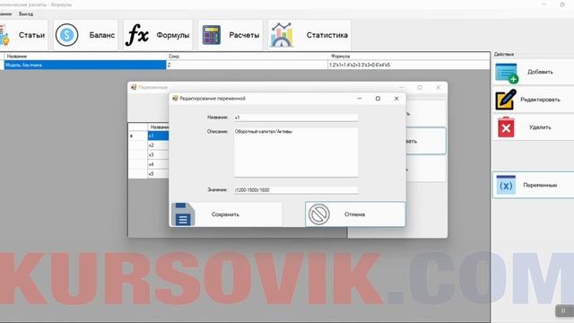 https://kursovik.com/programming/101450332.html Данный программный продукт предназначен для проведения экономических аналитических расчетов по различным формулам (например, Альтмана и др). Для этого пользователь указывает показатели компании по статьям расходов и расходов, заполняет формулу и назначает порядок расчета каждой переменной, после чего может сформировать итоговый расчет. Также пользователь может произвести сравнительный анализ по расчетам для компании в указанный период и просмотреть результаты как в табличном виде, так и в виде диаграммы. Среда разработки: Visual Studio. Среда программирования: Visual C# .NET 2020. База данных: MS SQL Server 2014. Приобрести исходники (все файлы проекта) данной программы Вы можете, заполнив следующую форму: https://kursovik.com/programming/101450332.html?camefrom=rutube#form Задать вопрос автору: https://kursovik.com/programming/101450332.html?camefrom=rutube#vopros Заказать отчёт(описание): https://kursovik.com/programming/101450332.html?camefrom=rutube#pz_need Заказать модификацию программы: https://kursovik.com/uniform.html?modify=101450332&camefrom=rutube Заказать новую программу (с чистого листа): https://kursovik.com/programming_order.html?camefrom=rutube Наш Телеграм-БОТ для поиска готовых работ по программированию https://t.me/kursovikcom_bot , в нашей базе более 5-ти тысяч готовых работ, для более эффективного поиска используйте наш Телеграм-БОТ. Список наших готовых работ по программированию: https://kursovik.com/progtopic.html Разработка программ на заказ согласно Вашему заданию: https://kursovik.com/programming_order.html Мы пишем программы практически на всех языках программирования, работаем с различными базами данных, выполняем как мелкие задачки, так и крупные проекты. Разрабатываем и запускаем в работу ЧАТ-БОТы. Обращайтесь - всегда будем рады Вам помочь! Если нужно переписать данную программу на другой язык программирования - обращайтесь - сделаем. Адрес нашего сайта: https://kursovik.com Наши контакты: https://kursovik.com/contacts.html Наша группа ВК: https://vk.com/kursovik (всем подписчикам скидка 5%) Наш Телеграм-канал: https://t.me/kursovik (всем подписчикам скидка 5%) Наш Дзен-канал: https://dzen.ru/kursovik (всем подписчикам скидка 5%) Наш RuTube-канал: https://rutube.ru/channel/41864889 (всем подписчикам скидка 5%) Наш YouTube-канал: https://youtube.com/@kursovik_com (всем подписчикам скидка 5%) (скидка предоставляется на работы, выполняемые нашим сайтом на заказ (написание работы с чистого листа), скидки не суммируются :) #программирование #visualstudio #mssqlserver