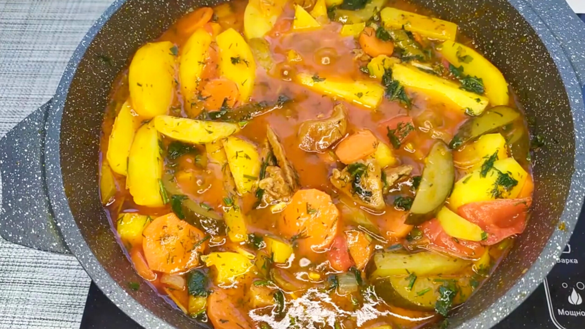 Сегодня готовлю азу по-татарски. Популярное блюдо еше с советских времен, представляет собой тушеное мясо с картошкой, овощами и солеными огурцами. Мясо 400 г Лук 1-2 шт морковь 1 шт Сладкий перец 1 шт Томатпаста 150 г Вода 500 мл Картофель 500-600 г Соленые огурцы 3-4 шт Чеснок 3-5 зубчиков Соль, сахар, перец по вкусу Зелень любая