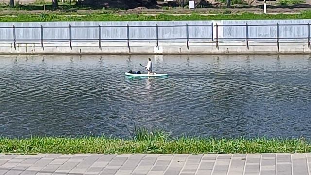 Мужик плывëт на байдарке в жару по реке в Орле. Безмятежность и настрой плюс уверенная гребля.