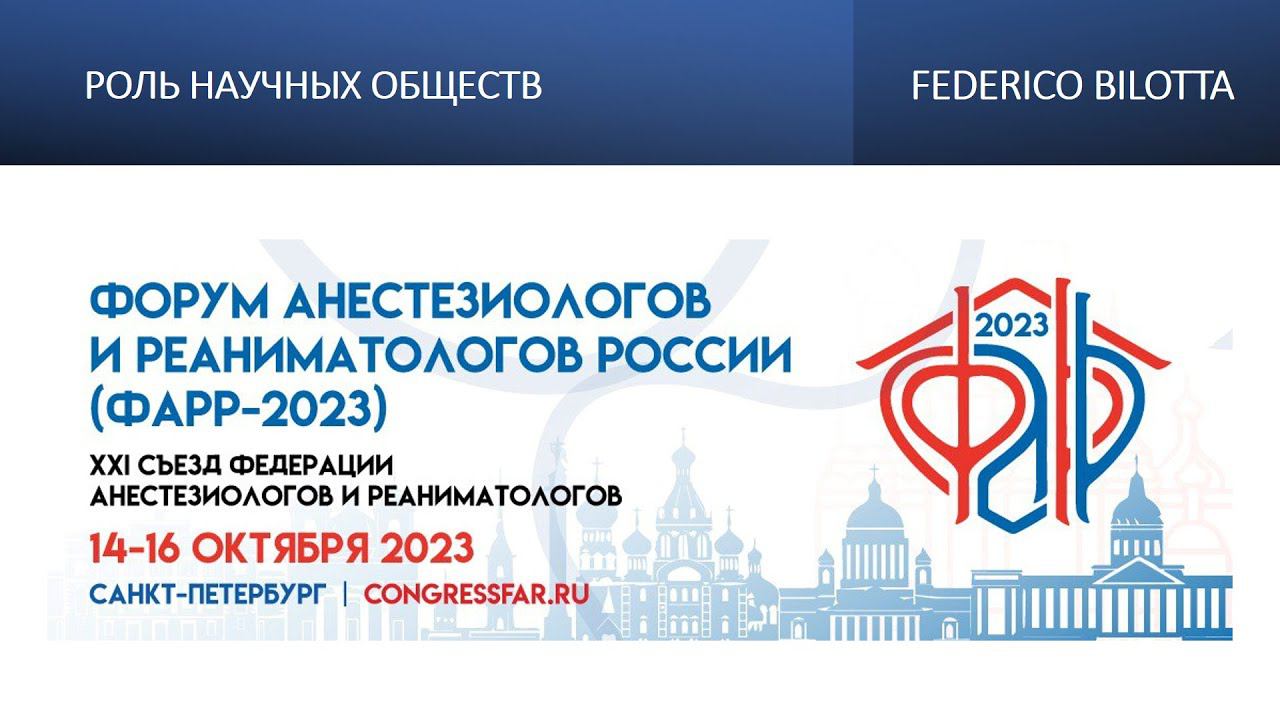 Видеозапись ФАРР-2023, XXI съезд Федерации анестезиологов и реаниматологов 14-16 октября 2023, Санкт-Петербург. Federico Bilotta "Роль научных обществ"