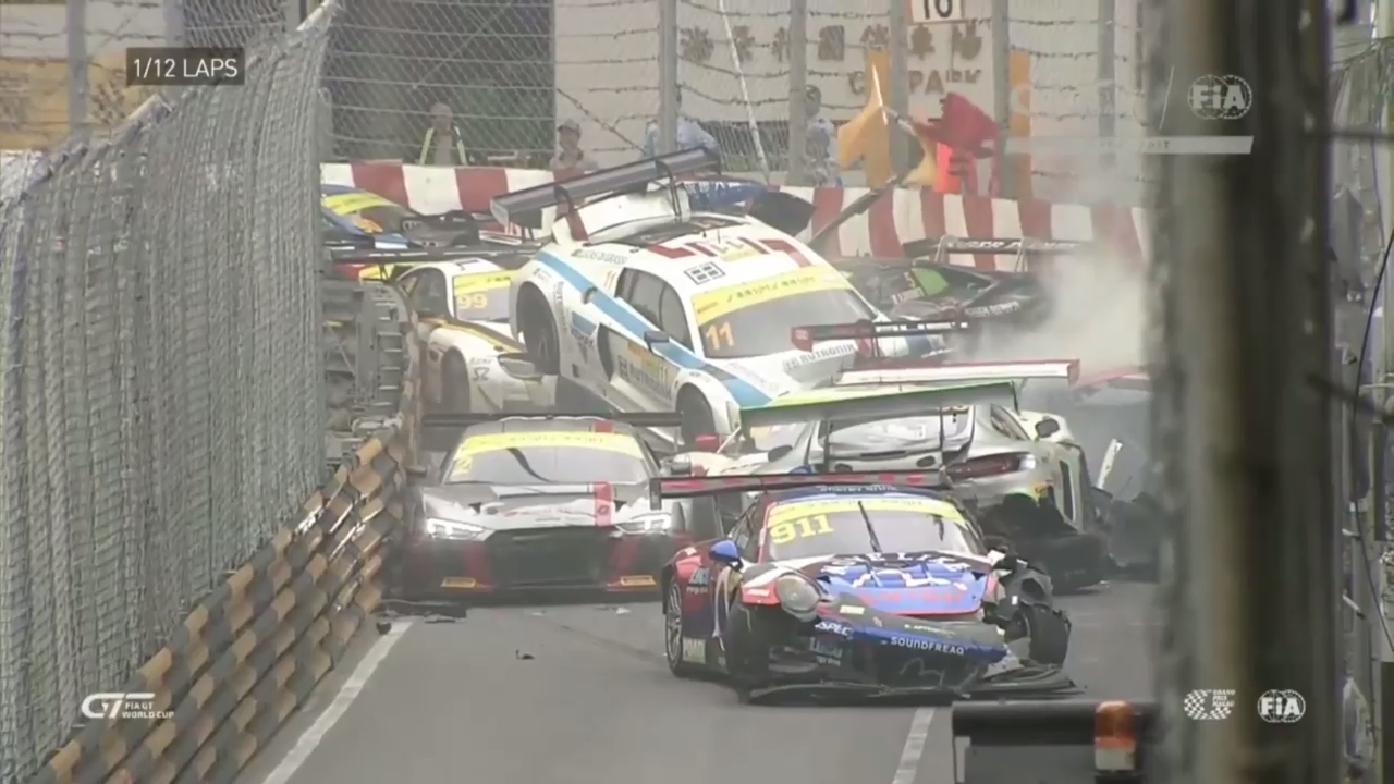 Организаторам пришлось остановить отборочную гонку чемпионата FIA GT в Макао из-за аварии с 12 автомобилями. #авария #дтп #гонка #макао