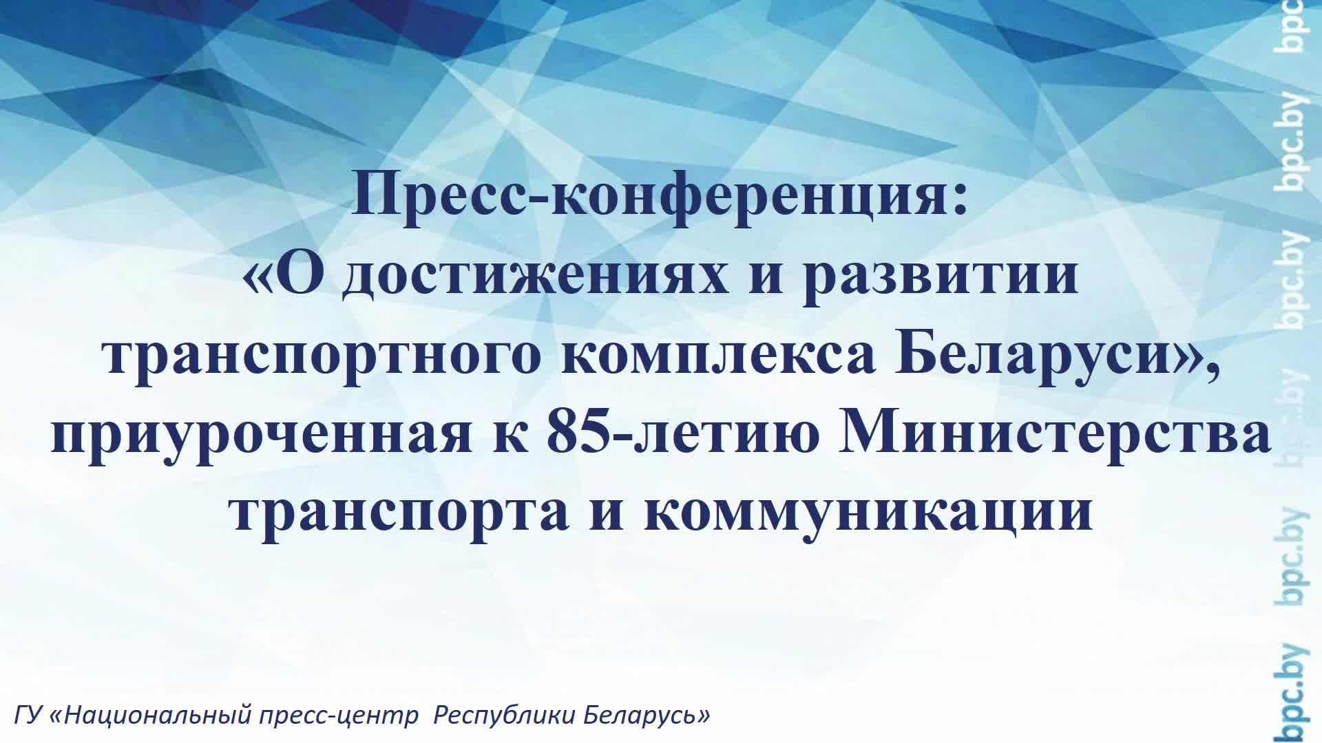 Пресс-конференция: «О достижениях и развитии транспортного комплекса Беларуси», приуроченная к 85-летию Министерства транспорта и коммуникации Гладкий Андрей Иванович – начальник управления автомобильного и городского пассажирского транспорта Минтранса, Глазко Григорий Владимирович – начальник главного управления автомобильных дорог Минтранса, Апет Александр Константинович - заместитель директора Департамента по авиации Минтранса, Шемет Сергей Анатольевич Заместитель начальника пассажирской службы - начальник отдела организации пассажирских перевозок Белорусской железной дороги, Каплевская Ирина Николаевна – Заместитель начальника службы грузовой работы и внешнеэкономической деятельности управления Белорусской железной дороги Задать вопрос: vopros@bpc.by Вся самая актуальная и оперативная информация о пресс-мероприятиях Национального пресс-центра Республики Беларусь будет публиковаться на нашем телеграм-канале. Подписывайтесь на нас: https://t.me/s/belpresscenter