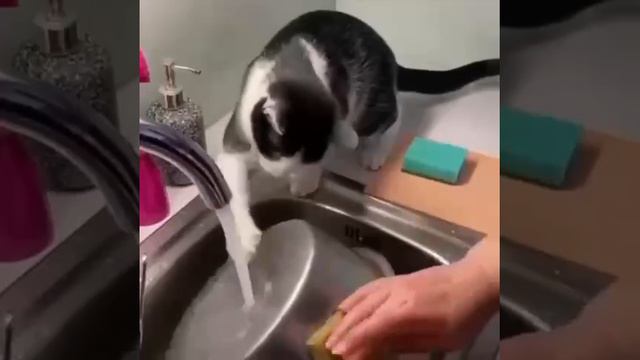 Котя помогает мыть посуду