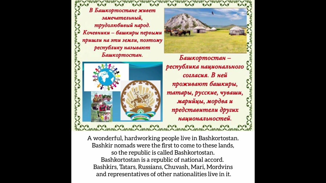 Международный конкурс «Расскажи миру о своей Родине» — проект по патриотическому воспитанию детей и молодёжи и формированию дружественных международных связей между подрастающими поколениями разных стран. «Меня зовут Алдаков Батыр. Мне 3 года. Я воспитанник МКДОУ № 3 «Радуга» ЗАТО пос.Солнечный Красноярского края. Сейчас я со своей семьей (папа, мама, сестричка и я) проживаем в Красноярском крае, так как мой папа военный. Но моя Родина - это Республика Башкортостан. Я очень люблю свою родную Башкирию, так как я там родился, там живут все мои родные. Мы с мамой очень были рады узнать о том, что проводится международный конкурс «Расскажи миру о своей Родине». Рассказали нам о нём наши воспитатели Трубицына Наталья Сергеевна и Александрова Светлана Николаевна. Это отличный шанс рассказать всем о моей любимой и удивительной Республике Башкортостан. Я уверен, что рассказ о моей Родине будет многим интересен. Люди захотят увидеть вживую природу, быт и людей нашей Башкирии. В процессе создания работы я ещё раз убедился в том, что очень люблю то место, где родился».