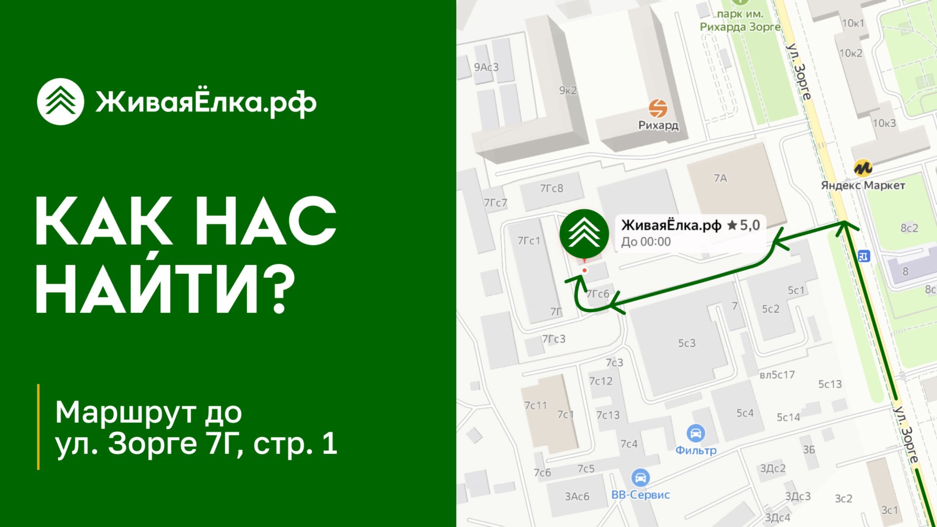 Где купить живую ёлку? Схема проезда к магазину ЖиваяЁлка.рф на Зорге 7Г, стр.1