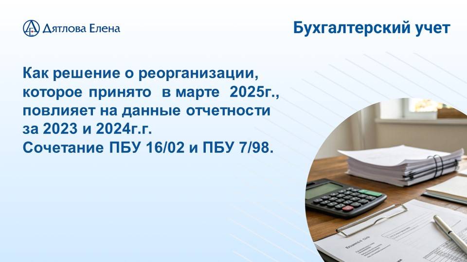 Влияние ПБУ 16/02 на годовую отчетность за 2024г. Елена Дятлова пояснит, как решение о реорганизации в форме выделения, которое принято в марте 2025г. повлияет на данные отчетности за 2023 и 2024г.г. Вебинар Е.М. Дятловой "Прекращаемая деятельность в БФО. Применение ПБУ 16/02" состоялся 27.02.2025. Раскрыты все тонкости учета операций по прекращаемой деятельности. Заявку на запись вебинара оставляйте на https://buchguru.vip. Е.М. Дятлова - налоговый консультант, эксперт-практик в решении самых сложных вопросов по бухгалтерскому учету и налогообложению с опытом работы 28 лет. 3500 клиентов по всей России .