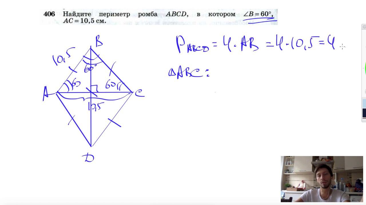 №406. Найдите периметр ромба ABCD, в котором ∠B=60°, АС = 10,5 см. Поддержать канал рублём - 5469400944002125 (Сбербанк) Мой второй канал для подготовки к ЕГЭ и ОГЭ - https://www.youtube.com/ЕвгенийСумин Инстаграм - https://www.instagram.com/EGE_OGE.math Личный инстаграм - https://www.instagram.com/ee_sumin VK - https://vk.com/evgeniysumin FB - https://www.facebook.com/EvgeniySumin