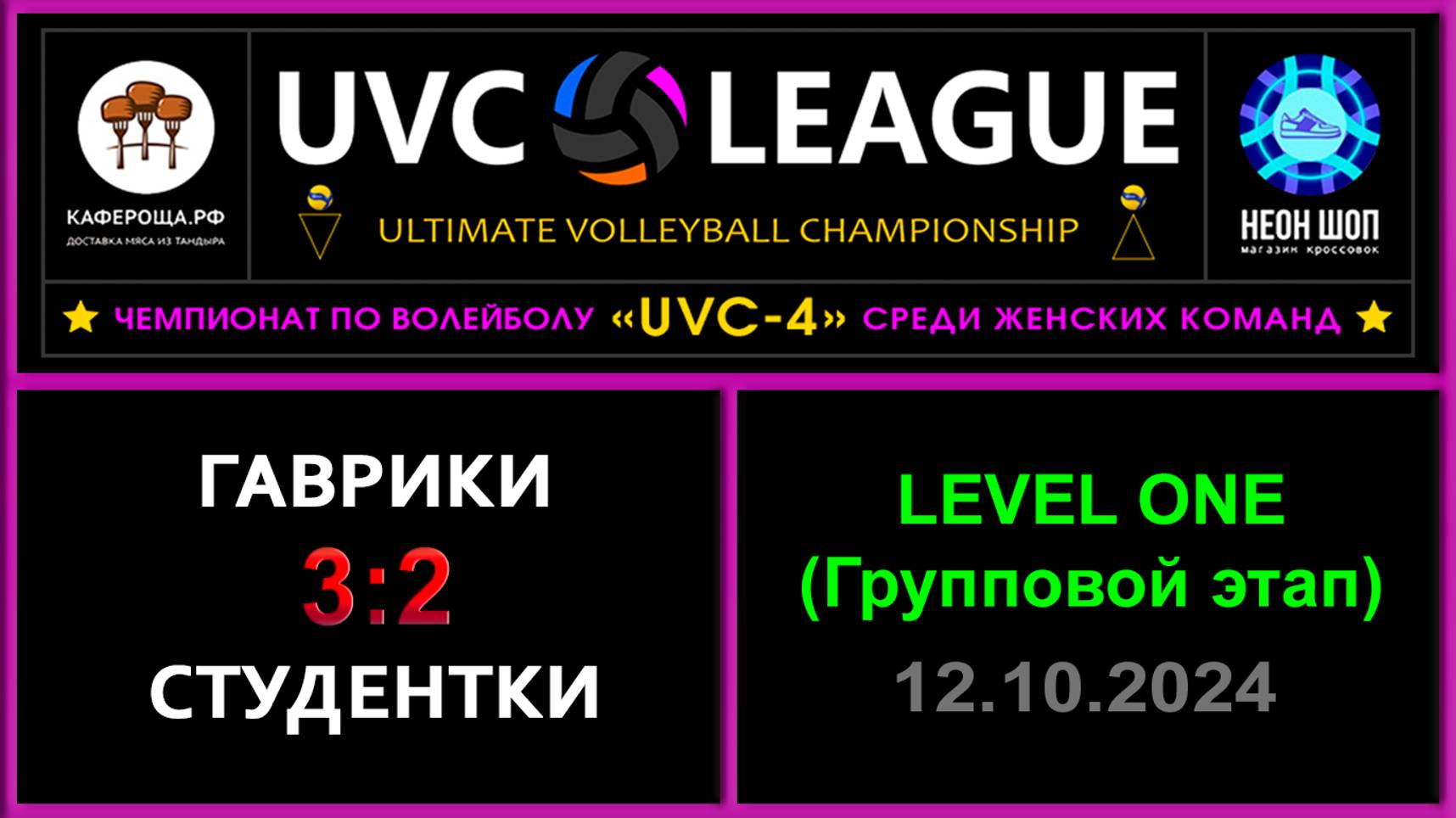 UVC-4 (Девушки): Чемпионат UVC Лиги по волейболу среди женских команд 2024-2025 гг. Результаты игры: LEVEL ONE (Групповой этап) 13.10.2024 Гаврики - Студентки 3:2 (25:21, 25:16, 16:25, 23:25, 15:13) Две партии Гаврики просто стабильно подавали, этого вполне хватало, а вот с третей партии Студентки стабилизировали прием и в целом игру, что помогло сравнять счет! Тай-брейк начался с 8:1 в пользу Гавриков, а в концовке счет был 14:5, а потом Студентки практически совершили чудо, набрав 8 очков подряд, в итоге это не помогло, но девушки были в шаге от крутейшего камбэка! ✅Обе команды прошли в следующий этап конкурса «РЕШАЛА»! 🥁В конкурсе «Робин Гуд» Иван Зубарев отметился точным броском, и не стал участвовать во втором этапе! Иван получил сертификат от Татьяны Свиткиной номиналом в 1000 р., на услуги массажа!🔥🔥🔥 #UVC_ЛИГА_ЧЕМПИОНАТ_UVC_4_Девушки