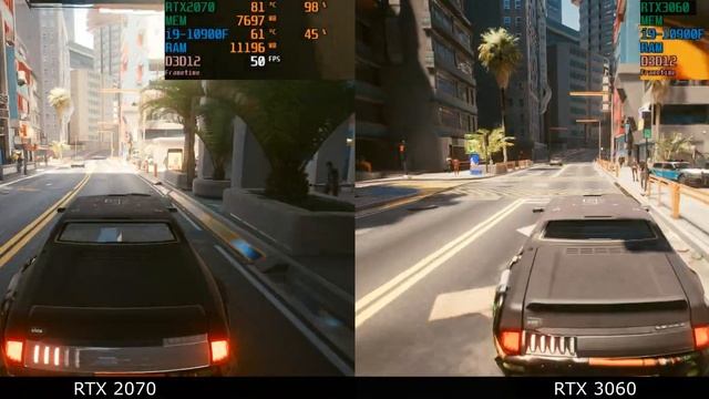 Comparison of the performance of rtx2070 vs rtx3060 desktop video cards. Maximum settings + RTX + DLSS "ultraperformance" at Ultrawide 2k monitor 3440x1440. Sorry, I forgot to rename the name of the 3060 video card, so I had to use a picture instead of the name. But the video cards themselves were not mixed up, since the rtx3060 video card had lower temperatures due to more powerful cooling than the rtx2070 video card, and also look at the amount of video memory consumed. The RTX 2070 is limited to 8 GB, while the RTX 3060 can use up to 12 GB of video memory.