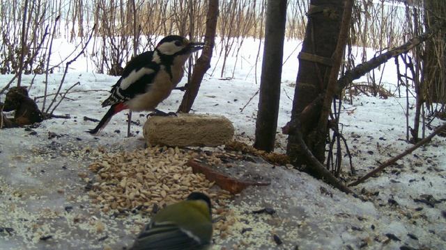 Дятел ест халву, наблюдение птиц в Великом Новгороде, 23 февраля 2024