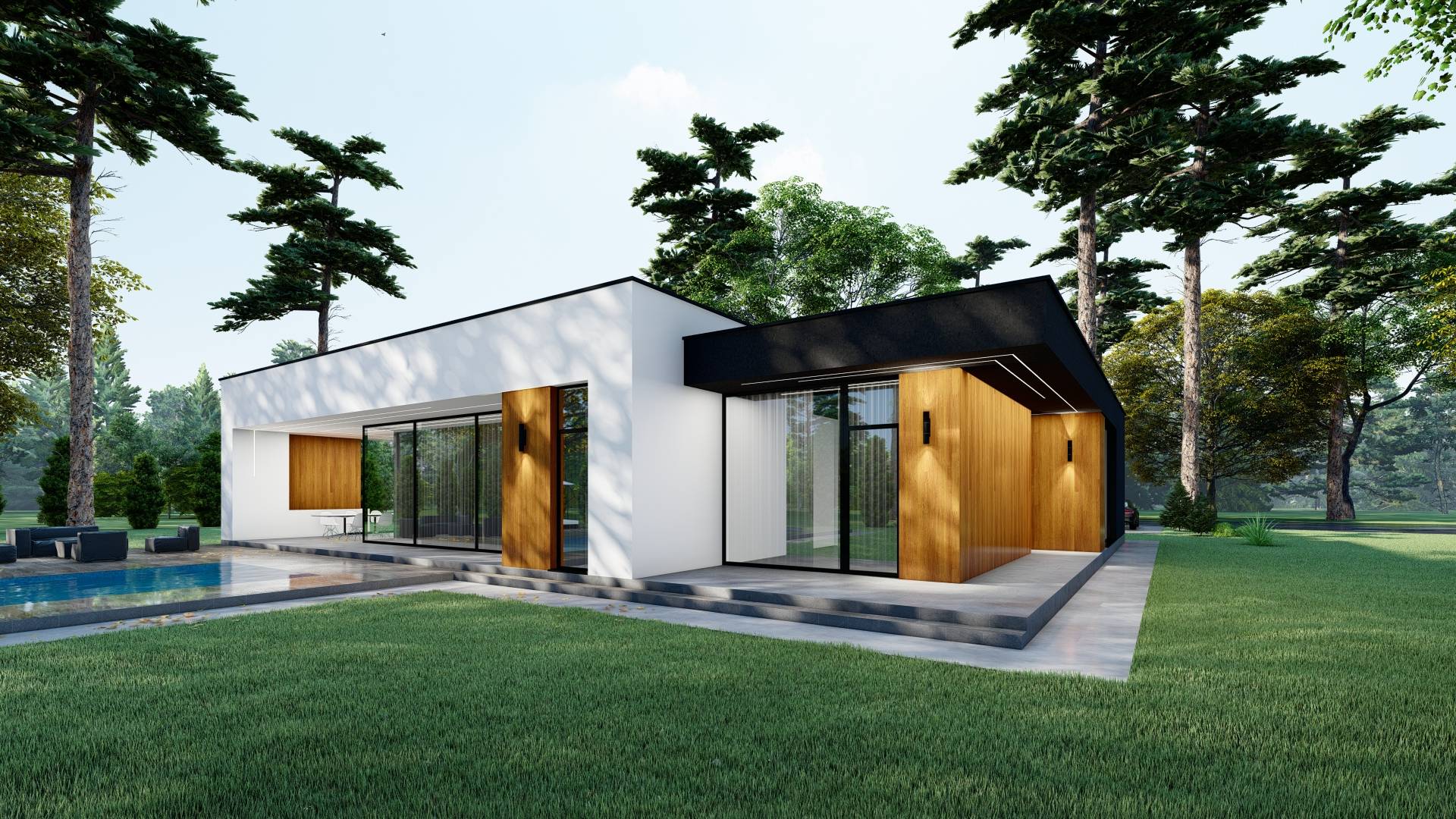 Проект 63_235 Просторный одноэтажный дом, спроектированный для комфортного проживания семьи с двумя детьми, выделяется продуманной планировкой, где каждая из спален оснащена собственным санузлом и гардеробной. В центре архитектурного решения находится большая совмещенная кухня-гостиная с высокими потолками и панорамными окнами, открывающими доступ к зоне барбекю и террасе с бассейном. Внешний облик здания выдержан в лаконичном стиле минимализма, сочетающем белую и темно-графитовую краску с фасадными панелями из ДПК под дерево, а наружные водостоки в виде цепи служат оригинальным завершающим штрихом в оформлении экстерьера. https://www.behance.net/gallery/238206275/Teignmouth-235-m2 👉 сайт: https://artdominika.ru 👉 ВКонтакте: https://vk.com/dominika_krd 👉 Бихайнс: https://www.behance.net/artDomiNika 👉 Пинтерест: https://ru.pinterest.com/enronikaen/ 👉 Телеграм: https://t.me/+NGgoQfQ11hkyMjQy