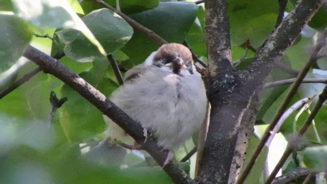 Птенец воробья задремал на веточке