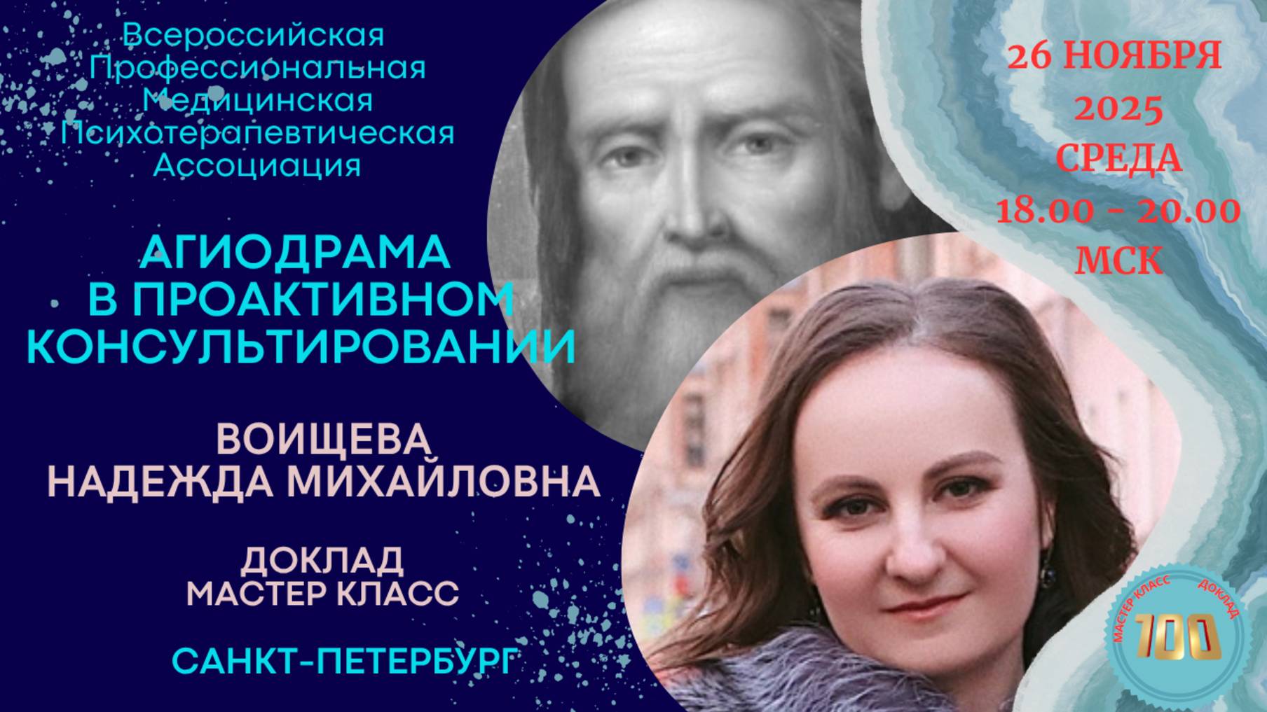 Заседание всероссийской Профессиональной Медицинской Психотерапевтической Ассоциации ПМПА). Формат проведения: гибридный - очно с онлайн трансляцией Дата проведения: 26.11.2025 г. с 18.00 до 20.00 (мск) Тема заседания: «АГИОДРАМА В ПРОАКТИВНОМ КОНСУЛЬТИРОВАНИИ» Воищева Надежда Михайловна – кандидат психологических наук; клинический психолог; глубинный межмодальный супервизор и гипервизор, обучающий личный терапевт ОППЛ, аккредитованный специалист в методе «Полимодальной психотерапии» СРО «Союз психотерапевтов и психологов»; агиодраматист; автор метода «Проактивное консультирование». 1. Тема доклада: «Особенности применение агиодрамы (психодрамы по житиям святых) в практике проактивного консультирования». 2. Мастер-класс: «Агиодрама по фрагменту жития преподобного Серафима Саровского». Присоединяйтесь к сообществу научно обоснованной психотерапии! С уважением, Секретариат Оргкомитета ПМПА: Михеева Ольга Викторовна, Чуб Роман Андреевич, Дьячкова Анна Юрьевна. Место проведения: Санкт-Петербург, ул. Достоевского, д.19/21 лит. Б, конференц-зал 3 этаж Высшая школа методологии (cт. метро Достоевская / Владимирская). Сайт: www.pmpa.ru Е-mail: pmpaspb@mail.ru