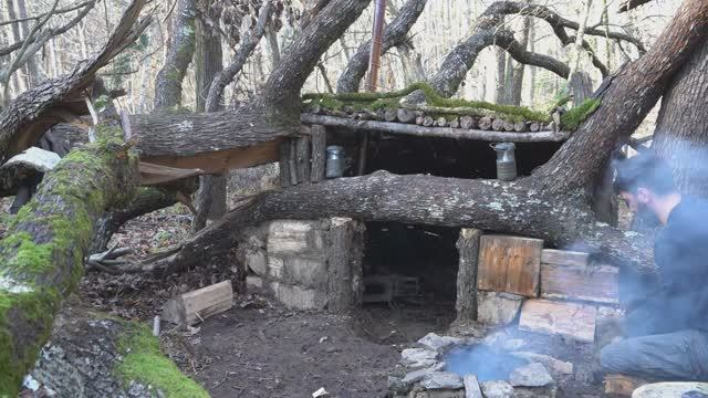 SOLO SURVIVAL CAMPING In RAIN Building a Secret Dugout UNDER a Fallen TREE; 3 Days