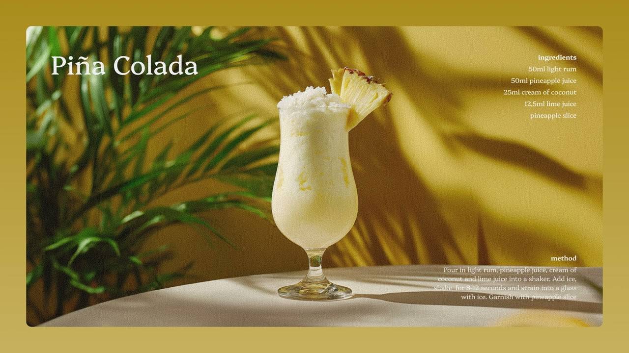 3 Jul 2025 Sip back. Relax. Let the vibes flow The Piña Colada a creamy, sweet, and tropical escape. A blend of dreamy tropical lounge and exotica chillout soundscape, featuring lush synths and mellow, ethereal melodies, perfect for unwinding, serene focus, or tranquil study. Track list: 0:00 Piña Colada 4:21 Beach Dream Elixir 7:41 By the Pool 11:13 Under the Shade 16:00 Island Bliss 19:52 Salty Air Synths 23:15 The Unending Summer 25:51 Coconut Cloud Serenade 29:53 Repeat Piña Colada recipe Ingredients: 50 ml light rum 50ml pineapple juice 25ml cream of coconut 12.5ml lime juice pineapple slice Method: Pour in light rum, pineapple juice, cream of coconut and lime juice into a shaker. Add ice, shake for 8-12 seconds and strain into a glass with ice. Garnish with pineapple slice Video is from "take a sip." channel