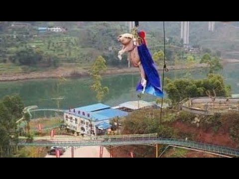 Живая свинья тестирует одну из самых высоких бенджи джампинг