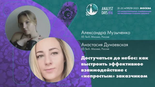 Александра Музыченко, Анастасия Дунаевская, Достучаться до небес: как выстроить эффективное взаимодействие с «непростым» заказчиком В своей практике аналитик взаимодействует с широким кругом лиц и порой диалог «не клеится». Вечное противостояние и, порой, отсутствие взаимопонимания между бизнес-аналитиком и Заказчиком. Согласитесь, хотя бы раз в своей работе вы сталкивались с данной проблемой. В рамках доклада: Поговорим о том, как найти подход к Заказчикам с техническим бэкграундом без ущерба для своей результативности. Что нужно знать и делать для того, чтобы было хорошо всем участникам процесса. Рассмотрим причины, почему Заказчик не принимает ваши бизнес-требования. Разберем, как договориться с техническими владельцами систем, как понять и транслировать свою ценность на проекте в качестве бизнес-аналитика. Рассмотрим практические советы и открыто поговорим о наболевшем. Доклад будет интересен тем, кто: работает на Enterprise проектах; столкнулся с тем, что его Заказчик = ИТ-эксперт; испытывает сложности в выстраивании коммуникаций на проекте.