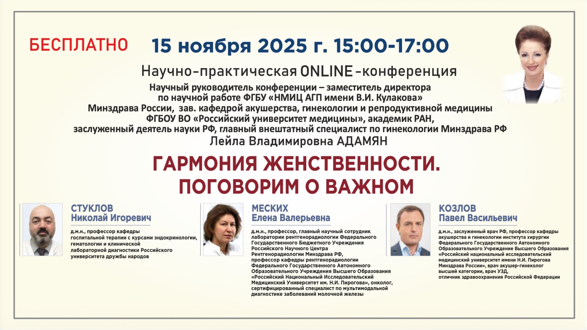 Научно-практическая онлайн конференция: ГАРМОНИЯ ЖЕНСТВЕННОСТИ. ПОГОВОРИМ О ВАЖНОМ Сохранение здоровья женщины на протяжении всей жизни – очень важный процесс. Системный подход к профилактическим мероприятиям позволяет обеспечить раннее выявление патологии, а также предупреждение более серьезных заболеваний. Современные методы диагностики и терапии должны быть основаны на принципах доказательной медицины и разработанных клинических рекомендациях. Такой подход дает нам возможность быть максимально эффективными. Мы рассмотрим новые научные данные и прогрессивные стратегии в наиболее актуальных тематиках в практике акушера- гинеколога, а также обсудим возможности современного подхода к ведению данных групп пациентов и особенности оказаниям им помощи. Научный руководитель конференции: АДАМЯН Лейла Владимировна Заместитель директора ФГБУ «НМИЦ акушерства, гинекологии и перинатологии имени В.И. Кулакова» Минздрава России, зав. кафедрой репродуктивной медицины и хирургии ФГБОУ ВО «Российский университет медицины», академик РАН, заслуженный деятель науки РФ, главный внештатный специалист по гинекологии Минздрава РФ Спикеры: СТУКЛОВ Николай Игоревич — д.м.н., профессор кафедры госпитальной терапии с курсами эндокринологии, гематологии и клинической лабораторной диагностики Российского университета дружбы народов МЕСКИХ Елена Валерьевна — д.м.н., профессор, главный научный сотрудник лаборатории рентгенорадиологии Федерального Государственного Бюджетного Учреждения Российского Научного Центра Рентгенорадиологии Минздрава РФ, профессор кафедры рентгенорадиологии Федерального Государственного Автономного Образовательного Учреждения Высшего Образования «Российский Национальный Исследовательский Медицинский Университет им. Н.И. Пирогова», онколог,сертифицированный специалистпо мультимодальной диагностике заболеваний молочной железы КОЗЛОВ Павел Васильевич — д.м.н., заслуженный врач РФ, профессор кафедры акушерства и гинекологии института хирургии Федерального Государственного Автономного Образовательного Учреждение Высшего Образования «Российский национальный исследовательский медицинский университет имени Н.И. Пирогова Минздрава России», врач акушер-гинеколог высшей категории, врач УЗД, отличник здравоохранения Российской Федерации ПРОГРАММА КОНФЕРЕНЦИИ: 1) "ДЕФИЦИТ ЖЕЛЕЗА — НЕРЕШАЕМАЯ ПРОБЛЕМА В 21 ВЕКЕ? ОБРАЩЕНИЕ ГЕМАТОЛОГА" ( Стуклов Николай Игоревич ) 2) "ДИАГНОСТИКА И ЛЕЧЕНИЕ ДДМЖ В СВЕТЕ КЛИНИЧЕСКИХ РЕКОМЕНДАЦИЙ. ЧТО ВАЖНО?" ( Меских Елена Валерьевна ) 3) "ПРИНЦИПЫ ЛЕЧЕНИЯ ВАГИНАЛЬНЫХ ИНФЕКЦИЙ В ПОЗДНИЕ СРОКИ БЕРЕМЕННОСТИ" ( Козлов Павел Васильевич ) «Дискуссия. Ответы на вопросы» Адамян Л.В., Стуклов Н.И., Меских Е.В., Козлов П.В.