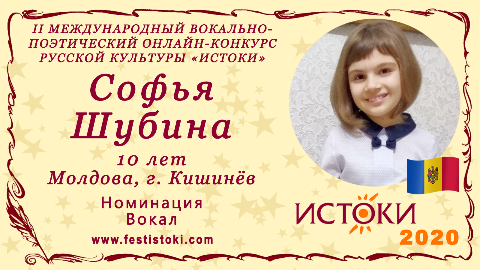 Лауреат III степени II Международного вокально-поэтического онлайн-конкурса русской культуры «Истоки». Номинация - Вокал. Песня "Песня русского сердца" Слова: Лев Ошанин, музыка: Анатолий Новиков. Сайт: www.festistoki.ru / www.festistoki.com E-mail: festistoki@mail.ru