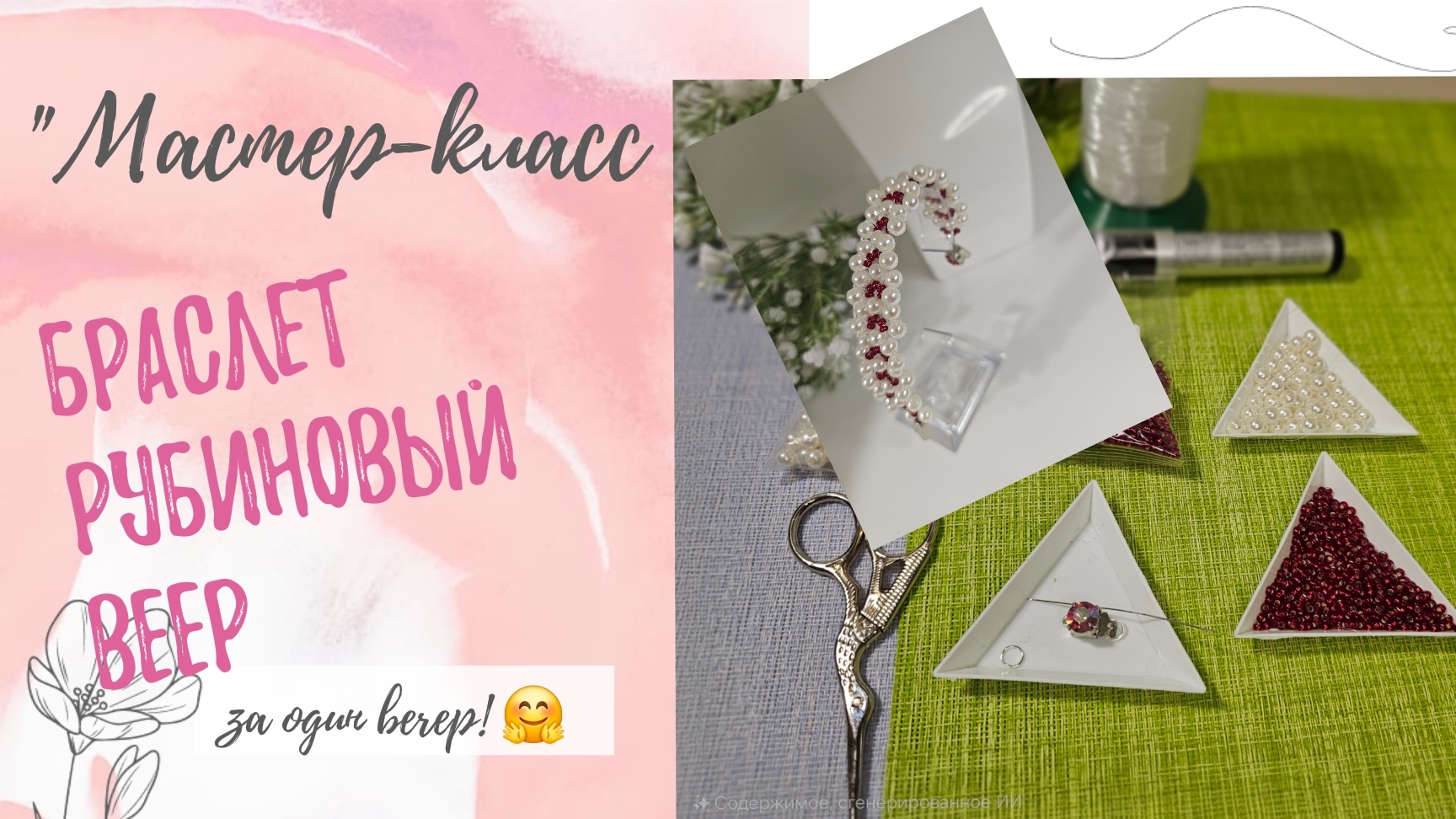#25 Мастер- класс. Браслет "Рубиновый веер"с жемчугом цвета Айвори. Плетение на нейлоновой нити.