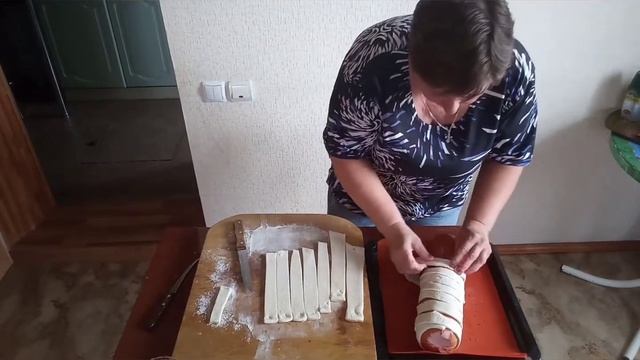 Тесто слоеное дрожжевое, батон колбасы и сосиска.