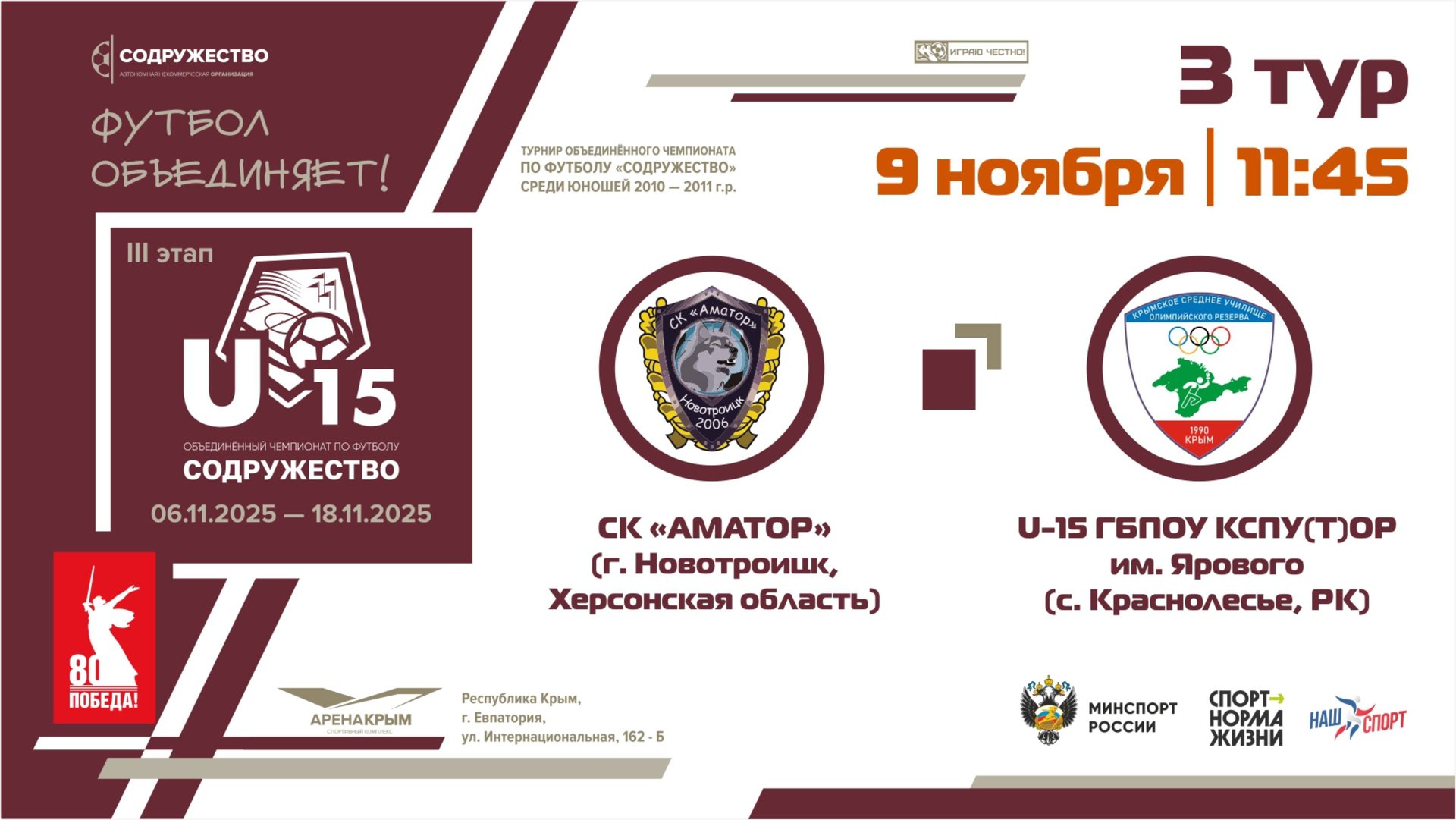 3 ТУР | U-15 | СК "Аматор" (Новотроицк, Херсонская обл) - УОР (U-15) (г. Краснолесье, РК) | 09.11.25