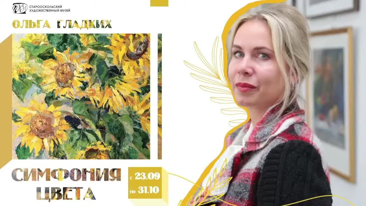 Живописные произведения Ольги Витальевны Гладких бережно хранят красоту всех времен года: многоцветие золотой осени, искрящиеся зимние снега, нежность первых весенних лучей, зной жаркого лета. Творческий диапазон художника широк – пейзажи, натюрморты, портреты. В залах Старооскольского художественного музея представлено более пятидесяти произведений масляной живописи и акварельной графики, которые демонстрируют высокий профессионализм художника–преподавателя и сильную творческую натуру. Работы Ольги Гладких выполнены в реалистическом стиле. В произведениях также прослеживается эксперимент с такими живописными стилями как пуантилизм, импрессионизм. Преимущественно художник работает в жанрах пейзажа и натюрморта. Экспозиция богата цветочными композициями, раскрывает удивительно светлый и солнечный мир радости и добра. Экскурсию проводит старший научный сотрудник Старооскольского художественного музея Ирина Шаповалова.
