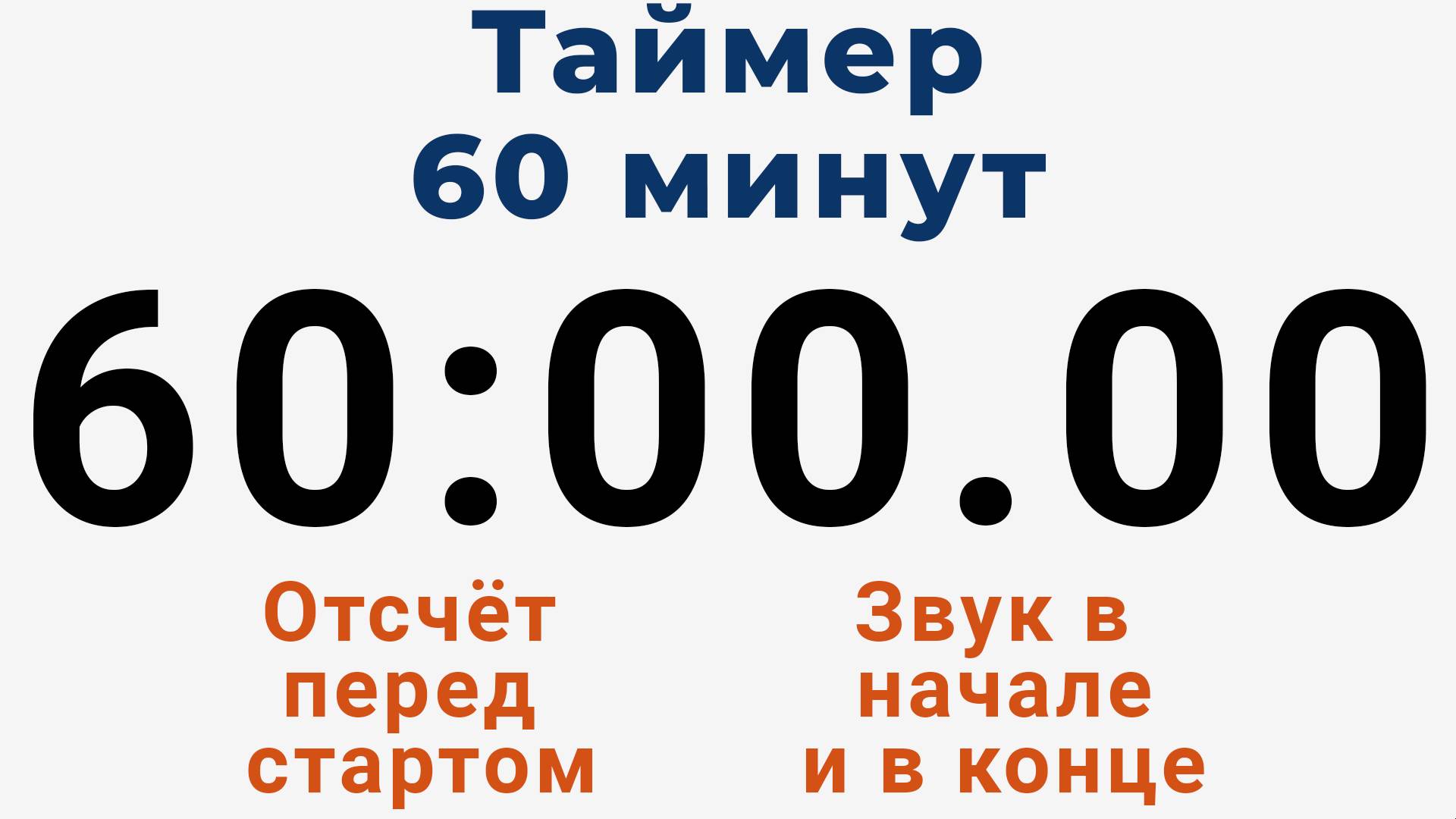 Таймер на 1 час с отсчётом перед стартом и звуковыми сигналами в начале и по завершении шестидесяти минут. Дополнительные настройки доступны на сайте канала - https://sekundomer.online/timer/1-hour/