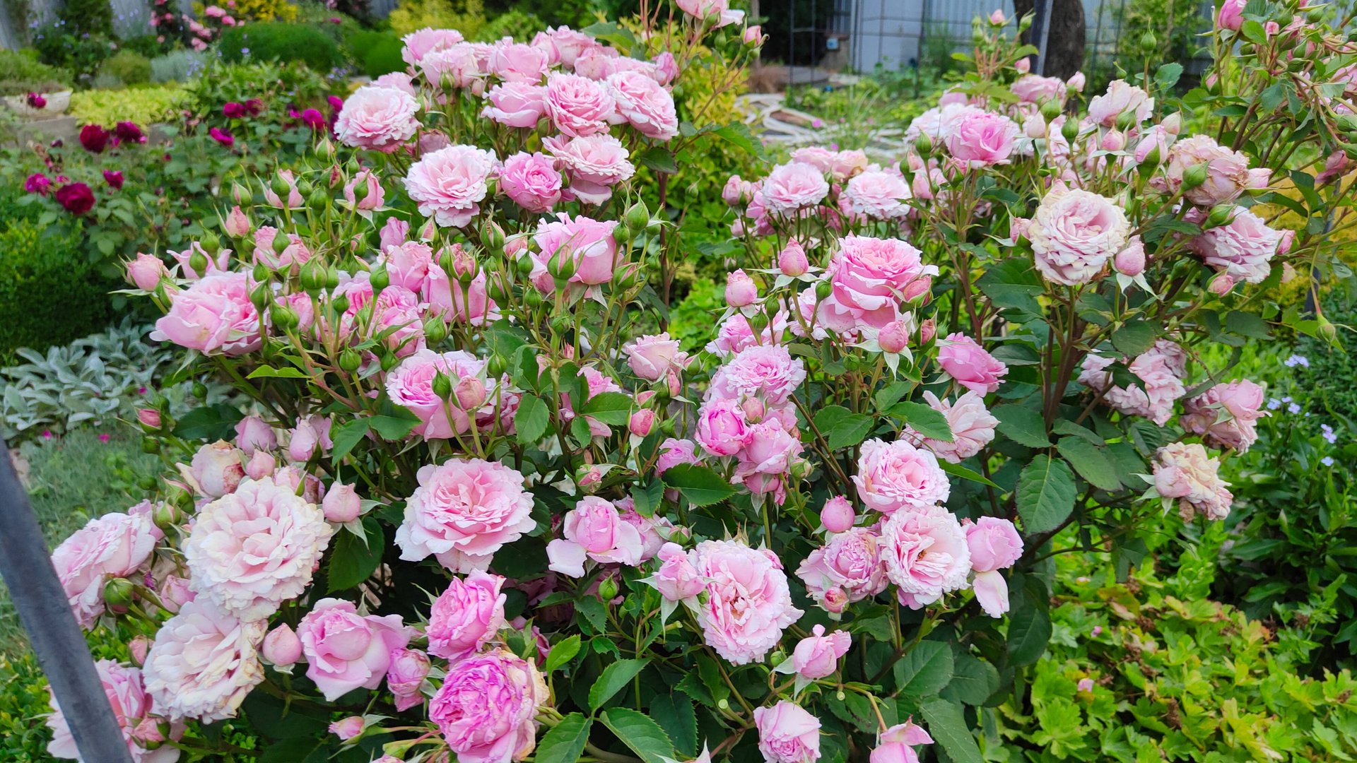 Зацвела роза Бьенвеню. Сад после ливня 24 и 26 июня 2025 г. Пятигорск. Дизайн сада, цветы.