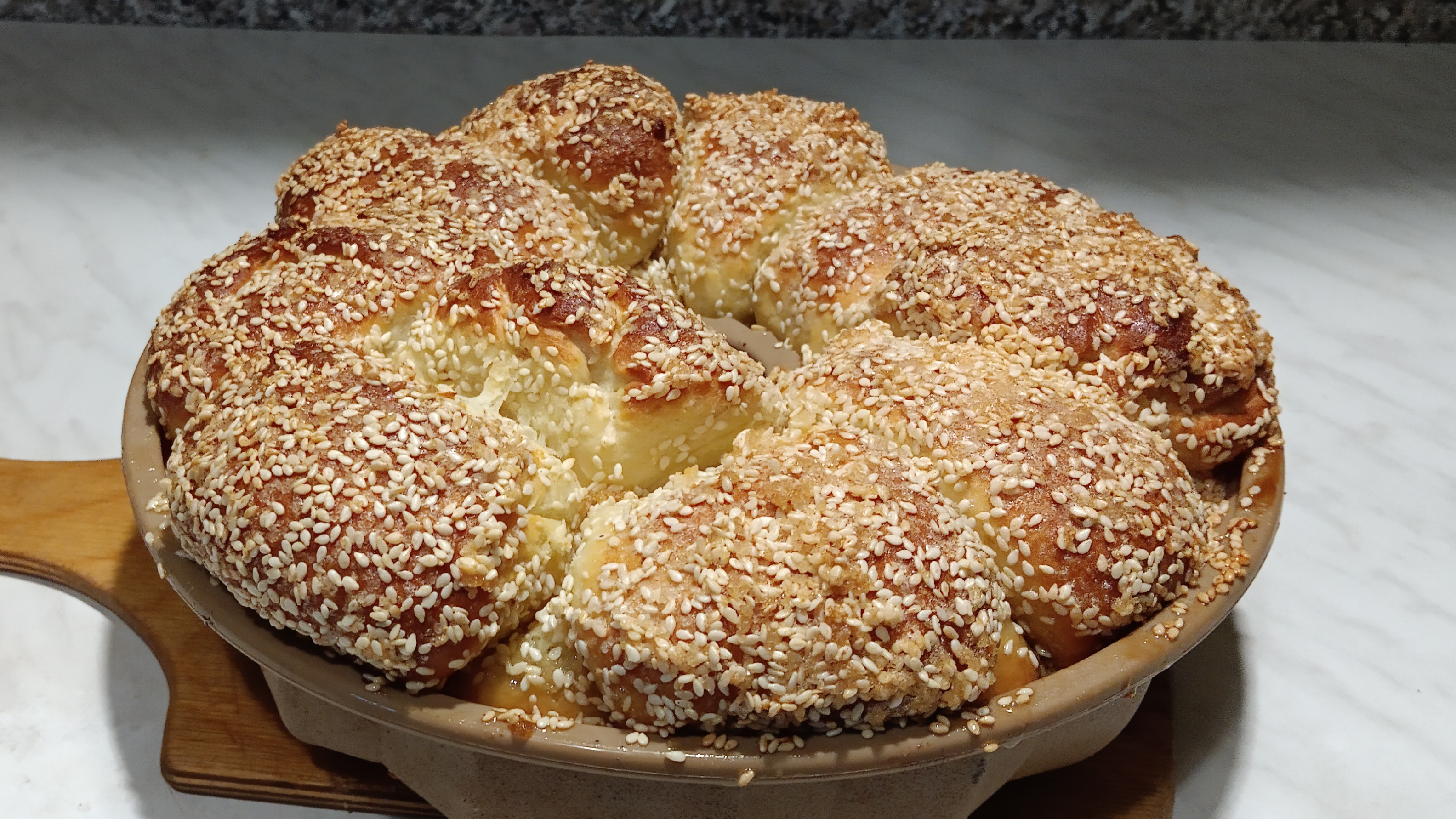 Пирог «Мартышкин хлеб» Ингредиенты: Для теста: Мука пшеничная 500 г Сахар 30 г Дрожжи сухие быстродействующие 6 г Молоко 250 мл Яйцо 1 шт. Сливочное масло 80 г Соль 1 щепотка Для начинки: Яблоки зелёные 2 шт. 300 г Сахар 60 г Корица молотая 3 ч. л. Для панировки: Сахар 120 г Кунжут 200 гр Сливочное масло 120 г Приготовление: В тёплое молоко отправить щепотку соли, сахар (30 г), 1 яйцо и дрожжи. Затем влить растопленное сливочное масло (80 г) и перемешать венчиком. Добавить муку в молоко с маслом и перемешать. Замесить тесто на столе, растягивая и подворачивая. Сформировать тесто в комок, отправить в миску и накрыть пищевой плёнкой. Отправить тесто в тёплое место на 1 час. Поднявшееся тесто обмять руками и убрать ещё раз в тёплое место, пока готовится начинка. Очистить яблоки от шкурки и нарезать мелким кубиком. Добавить к фруктам 3 чайные ложки корицы, сахар (60 г) перемешать. Из теста отщипнуть кусочки, накатать шарики, раскатать и сделать кружочки В каждый кружочек положить начинку (около ½-1 ст. л.) и скрепить края, сформировать шарик и перевернуть его швом вниз. Смешать в отдельной миске сахар (120 г) и кунжут (200гр.). Сливочное масло (120 г) растопить в сотейнике на минимальном нагреве. Каждый шарик обмакнуть со всех сторон в растопленном масле, обсыпать сахаром с кунжутом и переложить в форму для выпечки. Запанировать все шарики, выкладывая их рядом по кругу. Затем выложить ещё слой из шариков по кругу. Отправить пирог в заранее разогретую до 180 градусов духовку на 35 минут. Остывший пирог перевернуть на плоскую тарелку и подавать целиком, не разрезая на порционные куски, чтобы можно было отрывать куски-шарики руками. Приятного аппетита! #живемвдеревне #готовим #своимируками