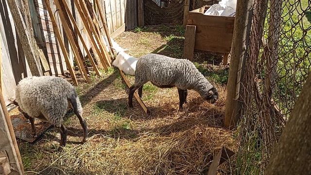 2 мая 2025 года. Вчера я ездил в Бор, приобрёл двух овечек. Теперь надо будет искать им барашка. Овечки катумской породы на 75%. Им больше трёх месяцев.