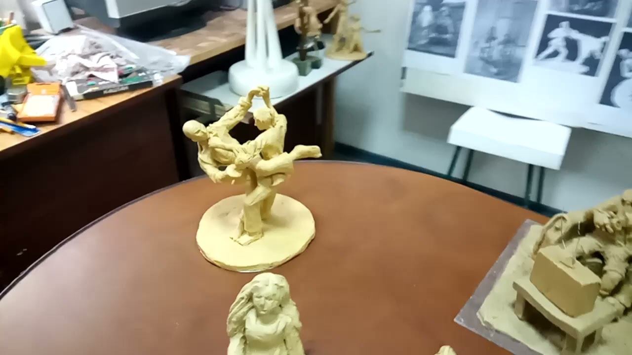 Учитель детально показывает ученикам разнообразие двухфигурных композиций из своего стенда — от простых бытовых сцен до сложных многофигурных сюжетов, обучая выбору устойчивых и выразительных композиций для лепки из пластилина. Бытовые и динамичные сюжеты Две бытовые сцены: отдых на природе, просмотр спортивного эпизода по ТВ — выразительные лица, движение, эмоции отличают от статичных фигур. Спортивная борьба: напряжённая схватка двух фигур, застывших в кульминации — экспрессия и динамика через позы. Произведения художников как ориентир Сложная композиция: всадник с беркутом на лошади — технически трудоёмкая из-за трёх животных и мелких деталей. Доступные бытовые жанры: молодые на коврике, пастухи у степи с лошадьми, музыкант на домбре и девушка со стиркой, велосипедисты в разговоре — устойчивые, выразительные сюжеты. Критерии выбора композиции Учитывая материал (пластилин), важны устойчивость (коврик, земля), выразительность лиц/движения и техническая выполнимость. Сложные многофигурные работы — для старших классов. Урок завершается ожиданием эскизов с пожеланием творческих успехов. Автор - художник Гончаров Николай Васильевич (1944-2025)