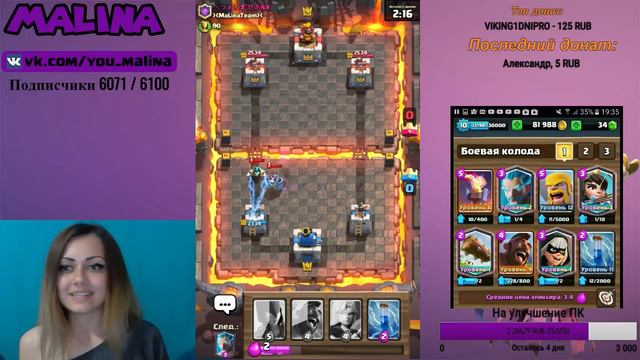 Поддержи меня: http://www.donationalerts.ru/r/malinaa Прайс-лист: Передать привет: 5 рублей Роспись на стене: 15 рублей Пиар клана: 30 рублей Сигна: 50 рублей Вступаем в кланы MaLina: Основа от 3400кубков-тег: #2PPOU2VC MaLinaTeaM2 от 2000кубков-тег: #VYUQPJ9 MaLinaTeaM3 от 2000кубков-тег: #2Y9U2YRQ Привет, меня зовут Анастасия Я играю в различные игры, общаюсь с любимыми подписчиками:) Подписывайтесь и ставьте палец вверх! Моя группа ВК: https://vk.com/you_malina Мой Facebook www.facebook.com/anastasia.shtuchko.7