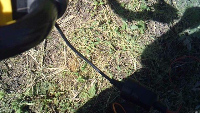 Кошу траву электрокосилкой (фрагмент). Рассказываю про дополнительное крепление провода.