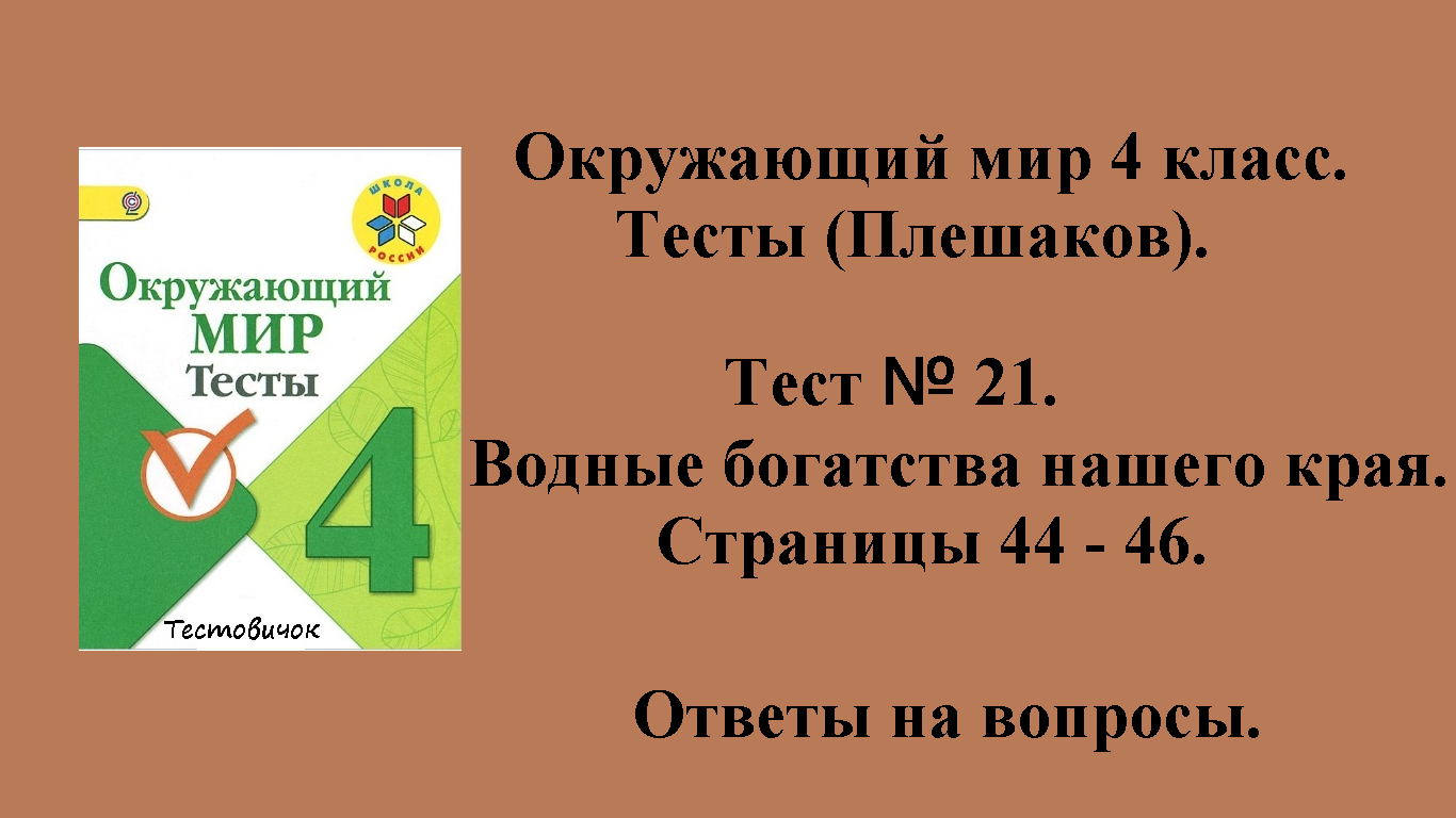 Ответы на вопросы Окружающий мир 4 класс тесты (Плешаков). Тест № 21. Водные богатства нашего края. Страницы 44 - 46. Подписываемся на канал. Делимся в соцсетях.