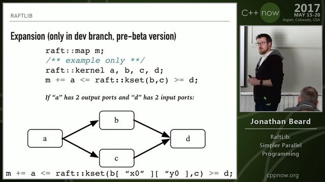 http://cppnow.org — Presentation Slides, PDFs, Source Code and other presenter materials are available at: https://github.com/boostcon/cppnow_presentations_2017 — Almost every commodity compute device from cell phone to server has a heterogeneous multicore processor inside it. To use these complex cores, we must write code that can execute in parallel. Effective use of multicore hardware with today’s tools requires that a programmer know a lot about the hardware. This was feasible with a single core, and two cores, but how about a hundred? What happens with cores that are of different types? How about multiple memory types? How about effectively programming these systems with differing link types for each of these processor-memory combinations? This hardware complexity is not well accommodated by current software models. RaftLib aims to abstract away this complexity to make authoring performant parallel applications in C++ as simple as possible, while giving the experienced programmer the control they desire without the boiler-plate code that often comes with lower-level APIs. It utilizes the familiar semantics of stream operators to link multiple parallel actors into a parallel, streaming application. RaftLib is built as a C++ template library, enabling programmers to utilize the robust C++ standard library along with RaftLib’s parallelization framework. RaftLib enables a programmer to write C++ code that will execute in multiple processes, multiple threads, user space threads, on distributed nodes, and with optional extensions, on accelerators without learning dozens of complex interfaces. This session covers the pitfalls of programming parallel hardware, offers RaftLib as a solution, and we'll walk programmers through how to use it effectively. — Jonathan Beard received a BS (Biology) and BA (International Studies) in 2005 from the Louisiana State University, MS (Bioinformatics) in 2010 from The Johns Hopkins University, and a PhD in Computer Science from Washington University in St. Louis in 2015. Jonathan served as a U.S. Army Officer from 2005 through July 2010 where he served in roles ranging from medical administrator, to Aide-de-Camp, to acting director of the medical informatics department for the U.S. Army in Europe. Jonathan is currently a computer architecture researcher focusing on next generation architectures for Big Data beyond exascale. Jonathan also has served as a technical advisor to many start-up companies, and has given talks ranging from performance modeling, to C++, to debating exascale memory architectures at Supercomputing. Jonathan's research interests also include online modeling of stream/data-flow parallel systems, streaming architectures, compute near data, accelerators for sparse compute, massively parallel processing, and self-sustaining bio-molecular machines. — Videos Filmed & Edited by Bash Films: http://www.BashFilms.com --- *--* ---